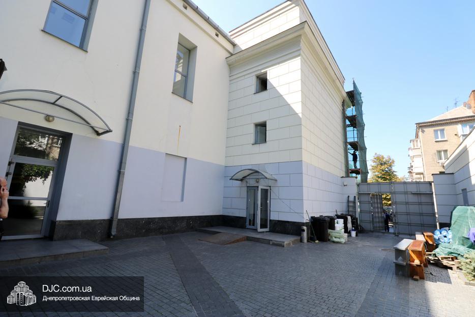 Сейчас фасад синагоги находится в лесах, обтянутых зеленой сеткой, и вход в главный молитвенный зал осуществляется через центр «Менора».