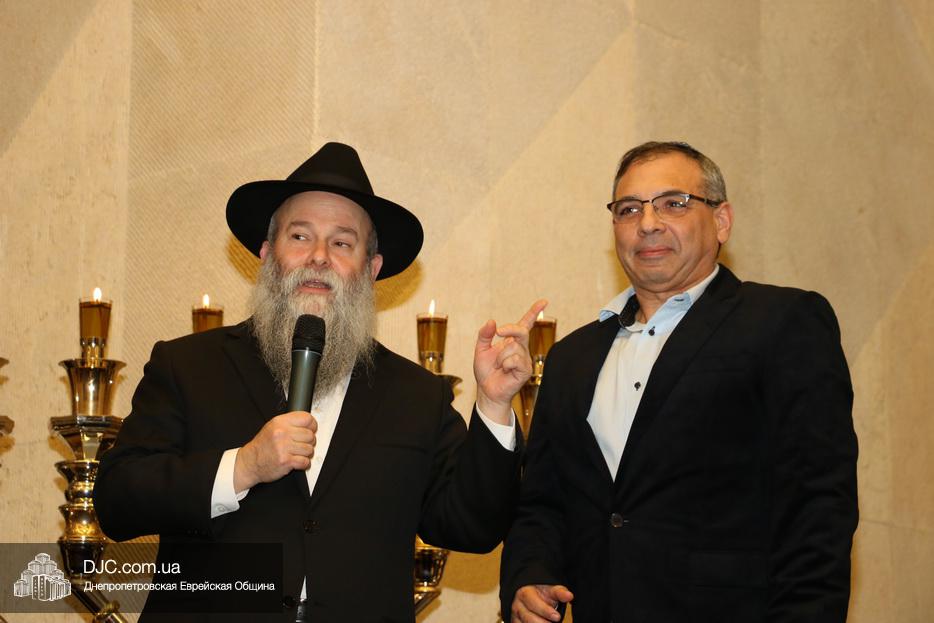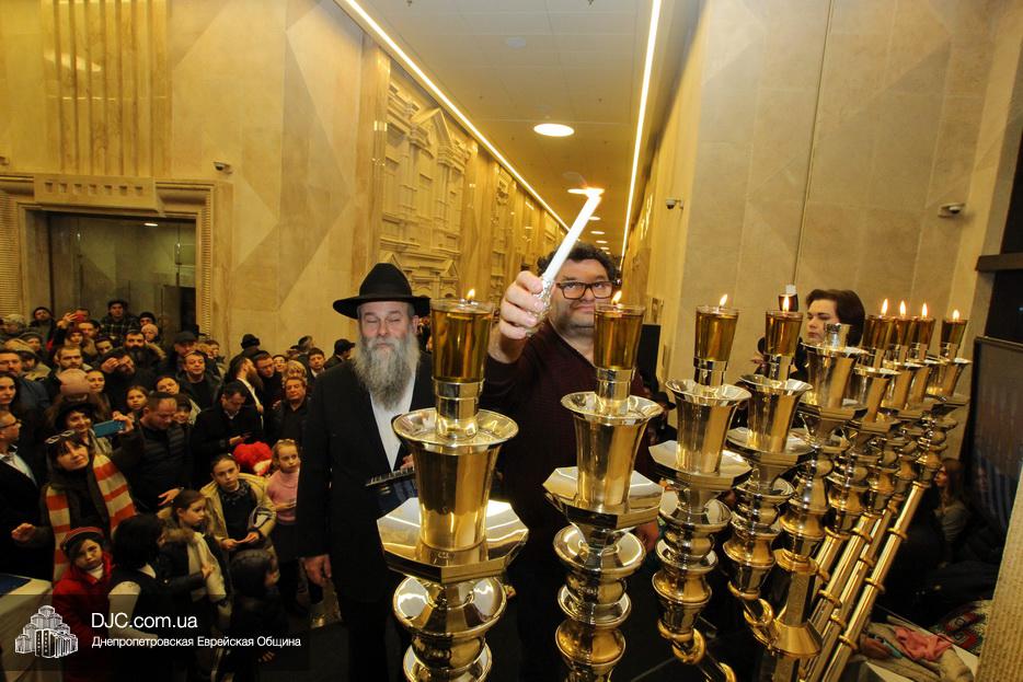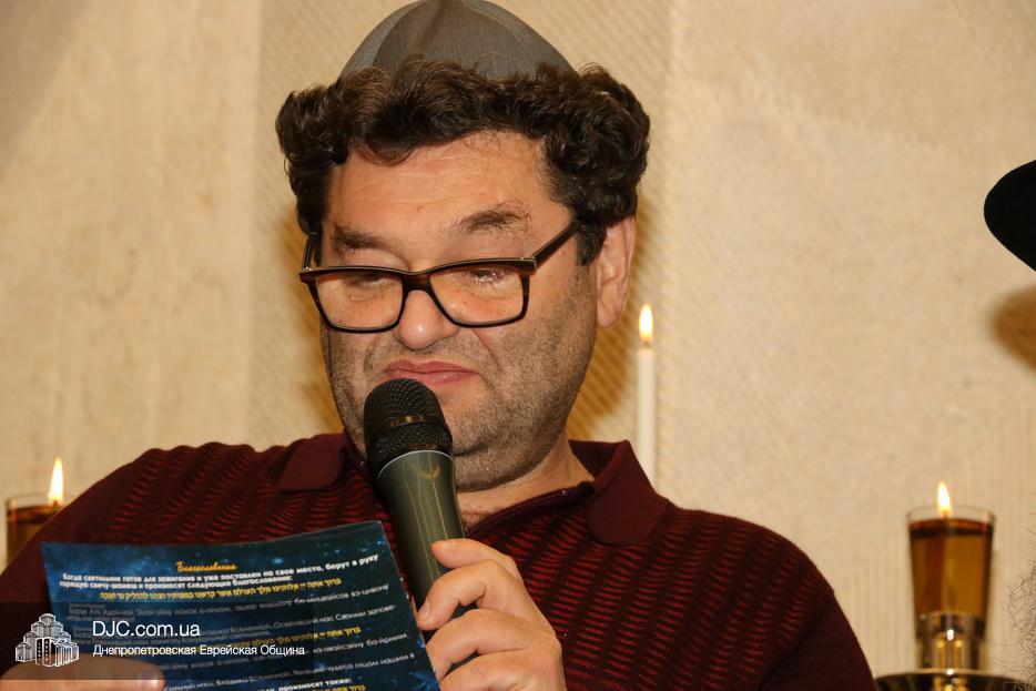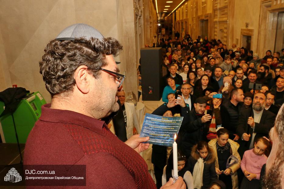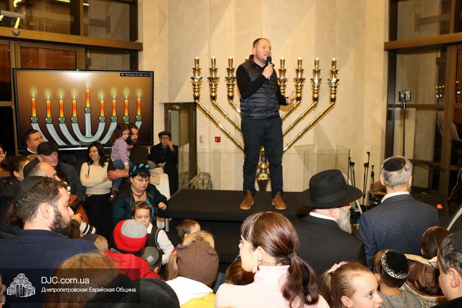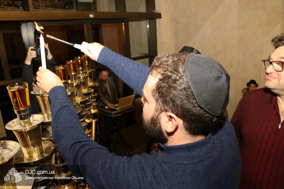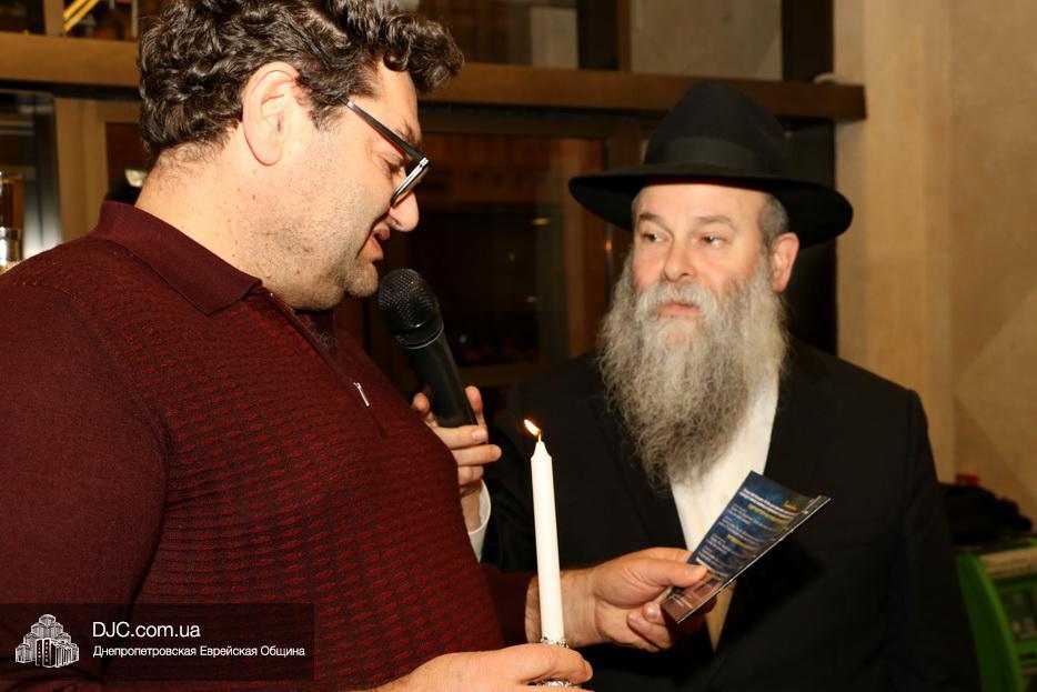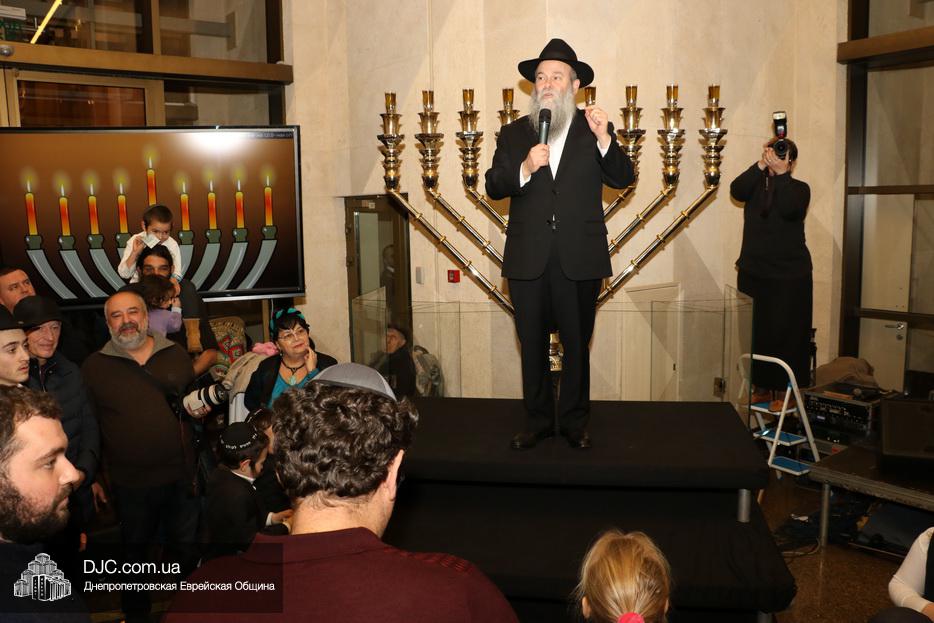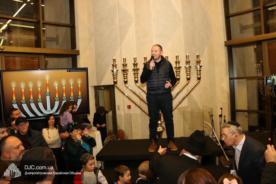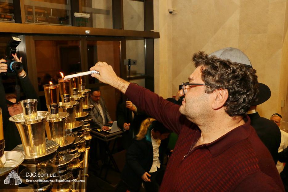 Перед церемонией зажжения еврейскую общину Днепра тепло поприветствовал Главный раввин Днепра и региона Шмуэль Каминецкий, который представил и рассказал о заслугах человека, которому предоставлена честь от имени всей общины выполнить эту важнейшую миссию – члена Попечительского Совета еврейской общины Днепра, господина Вадима Владимировича Ермолаева, который исполнил эту заповедь вместе со своим сыном Артуром (Борухом).