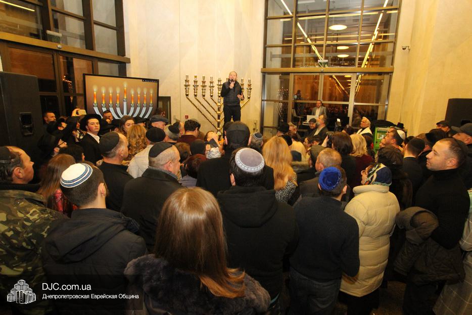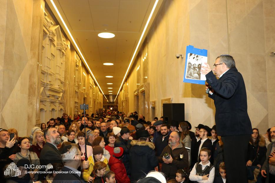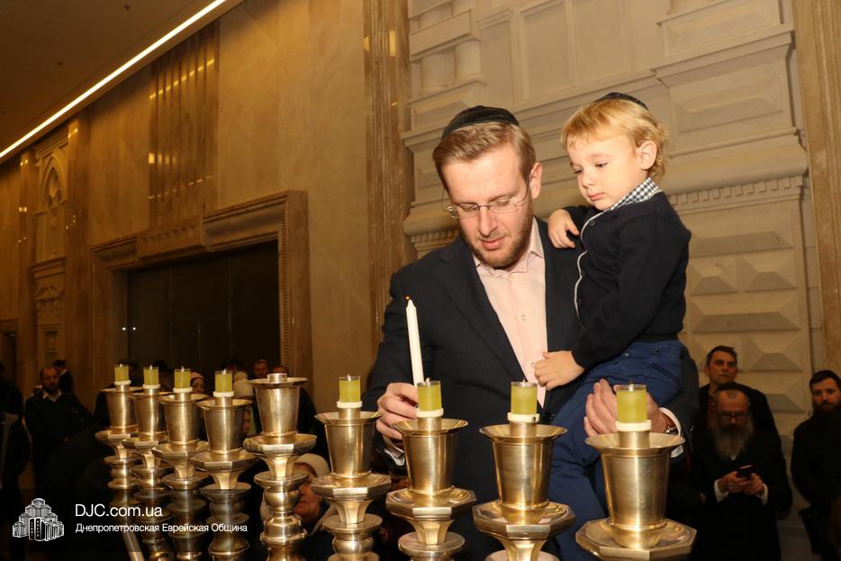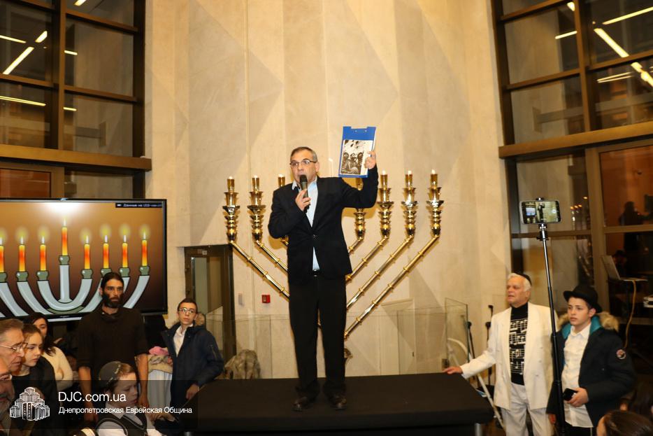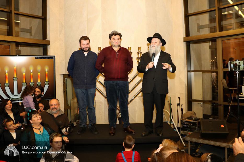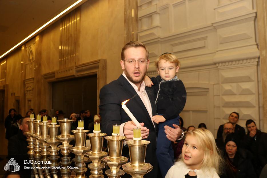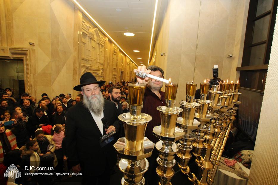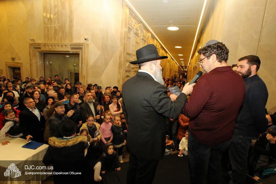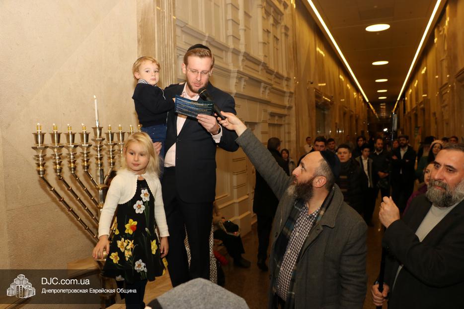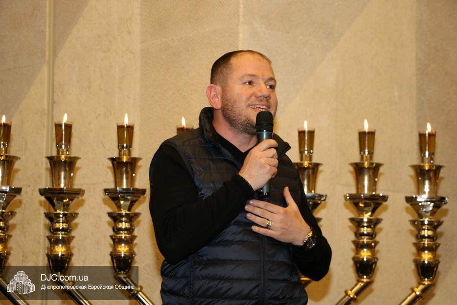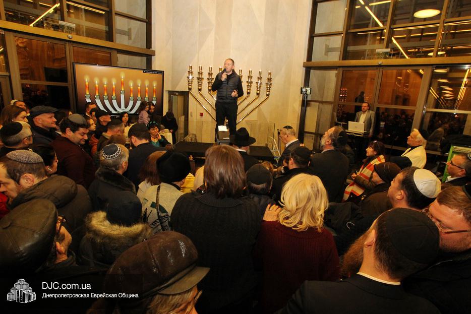 Перед церемонией зажжения еврейскую общину Днепра тепло поприветствовал Главный раввин Днепра и региона Шмуэль Каминецкий, который представил и рассказал о заслугах человека, которому предоставлена честь от имени всей общины выполнить эту важнейшую миссию – члена Попечительского Совета еврейской общины Днепра, господина Вадима Владимировича Ермолаева, который исполнил эту заповедь вместе со своим сыном Артуром (Борухом).