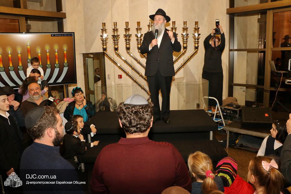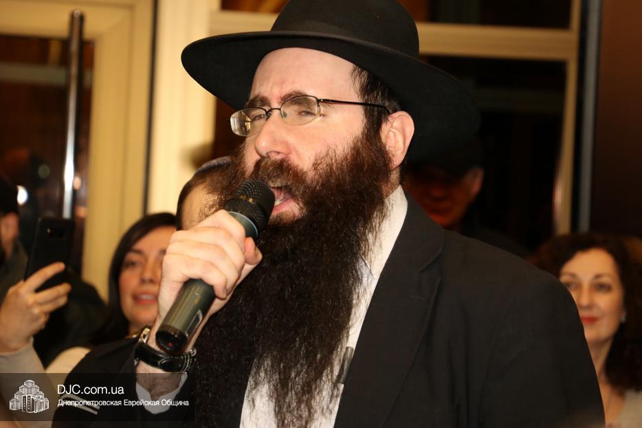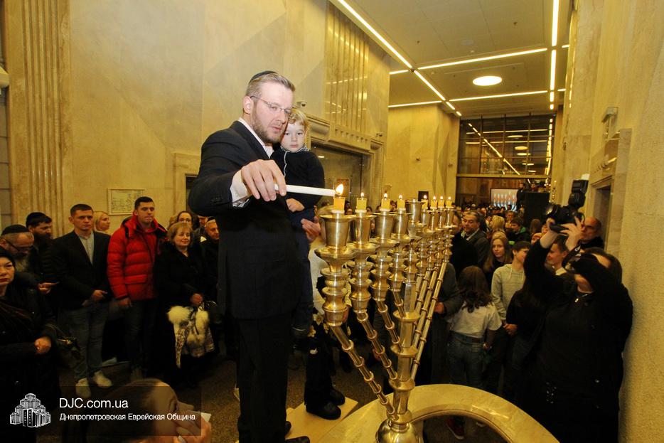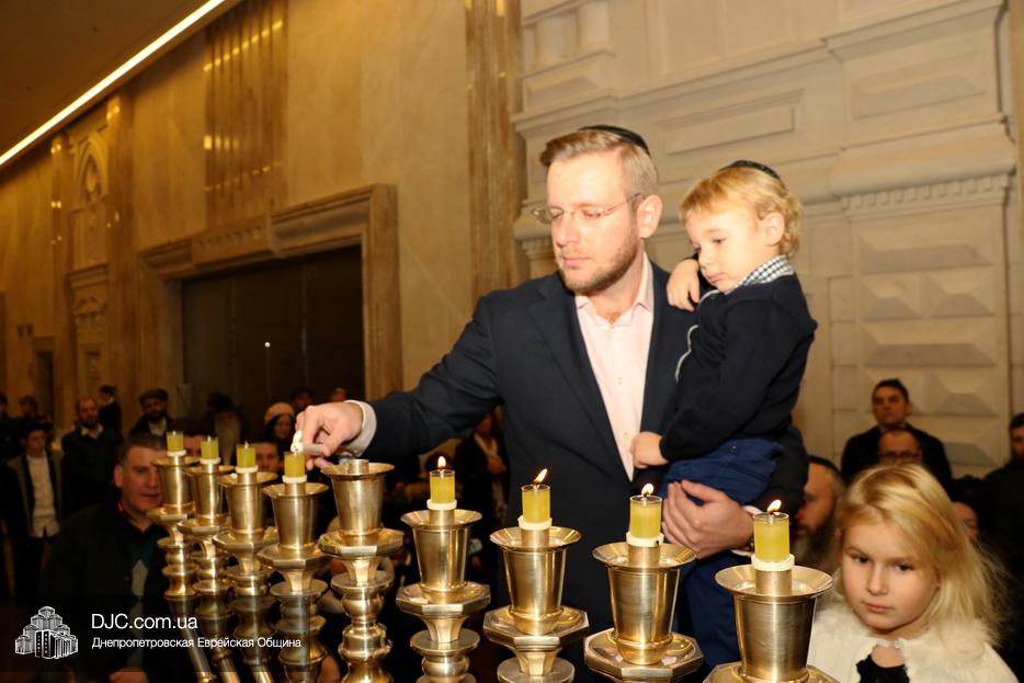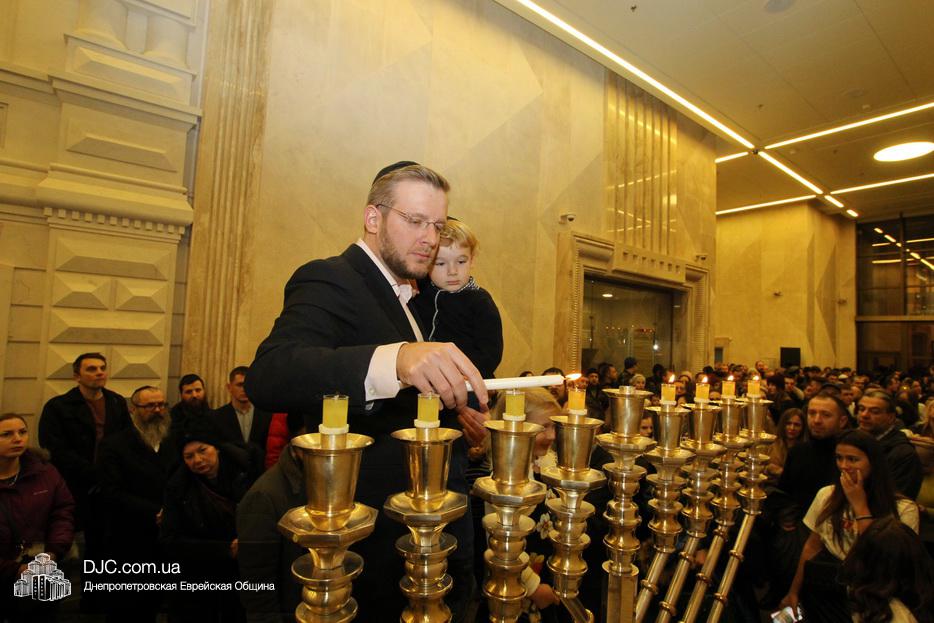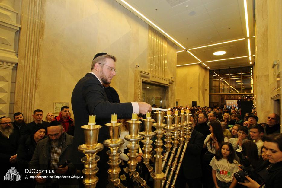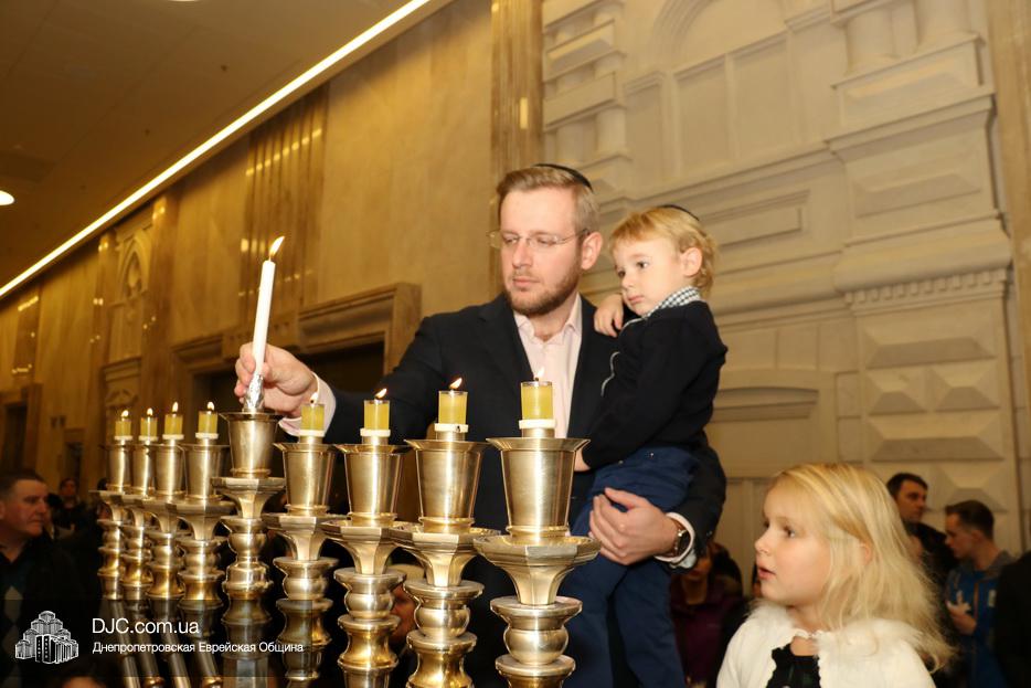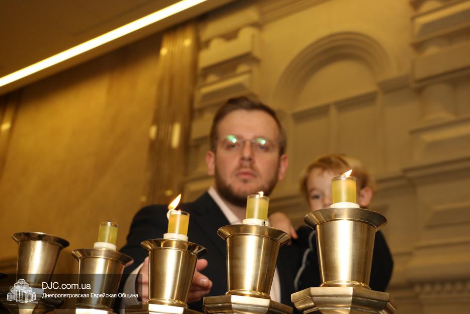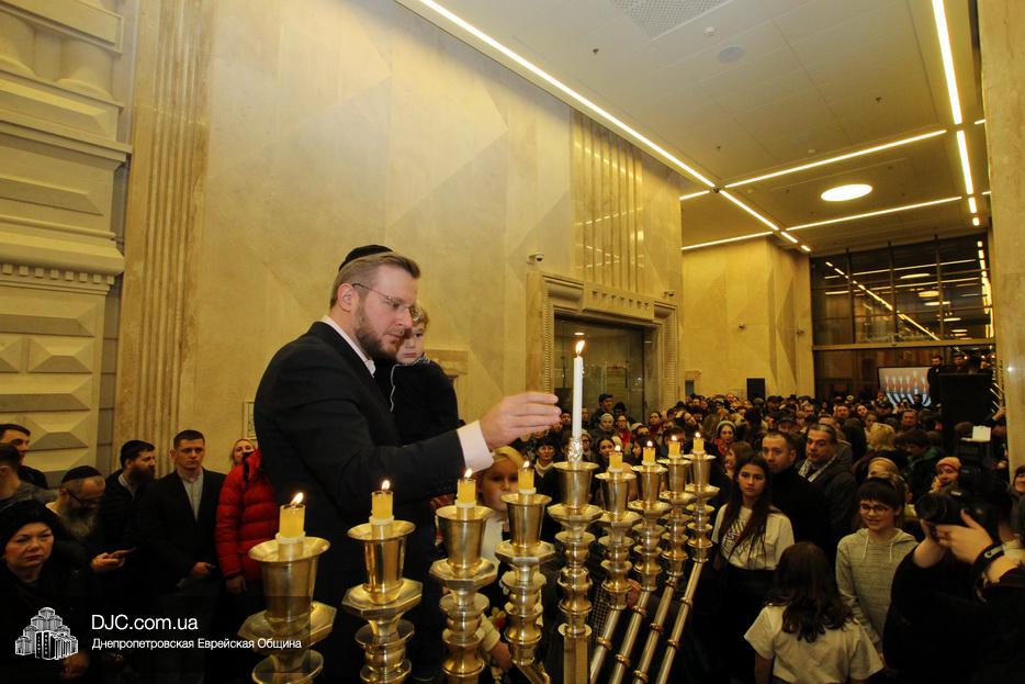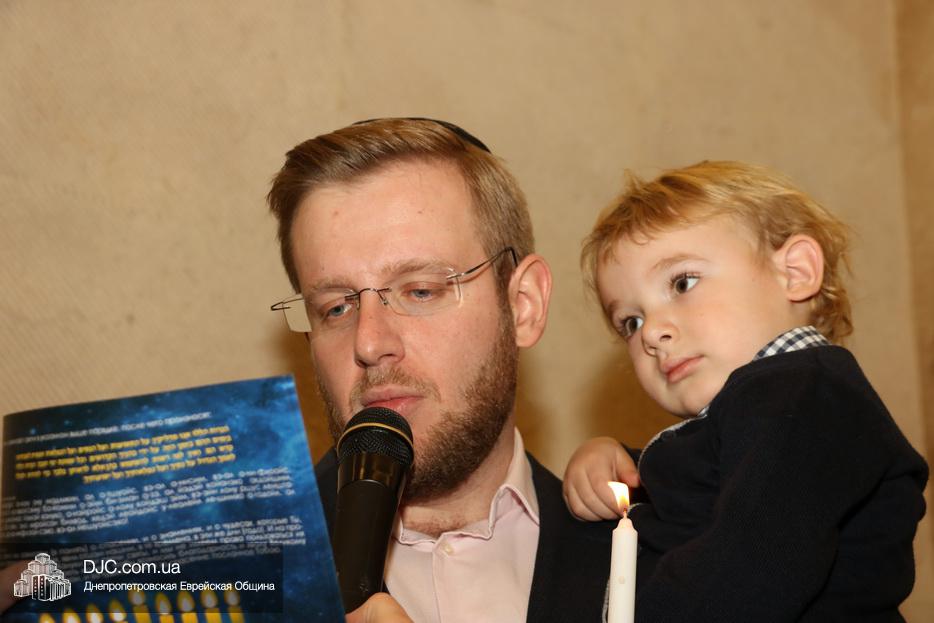 Перед церемонией зажжения еврейскую общину Днепра тепло поприветствовал Главный раввин Днепра и региона Шмуэль Каминецкий, который представил и рассказал о заслугах человека, которому предоставлена честь от имени всей общины выполнить эту важнейшую миссию – члена Попечительского Совета еврейской общины Днепра, господина Вадима Владимировича Ермолаева, который исполнил эту заповедь вместе со своим сыном Артуром (Борухом).