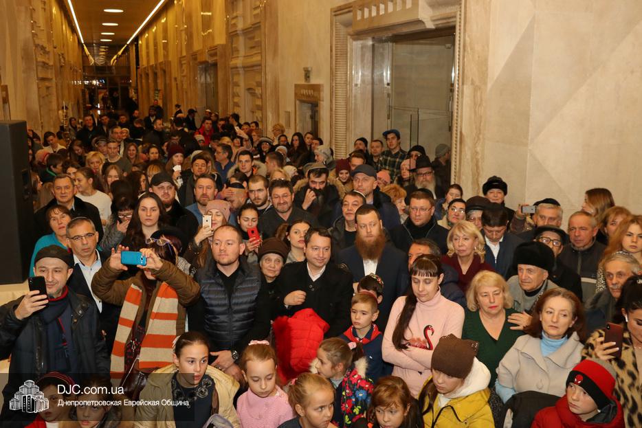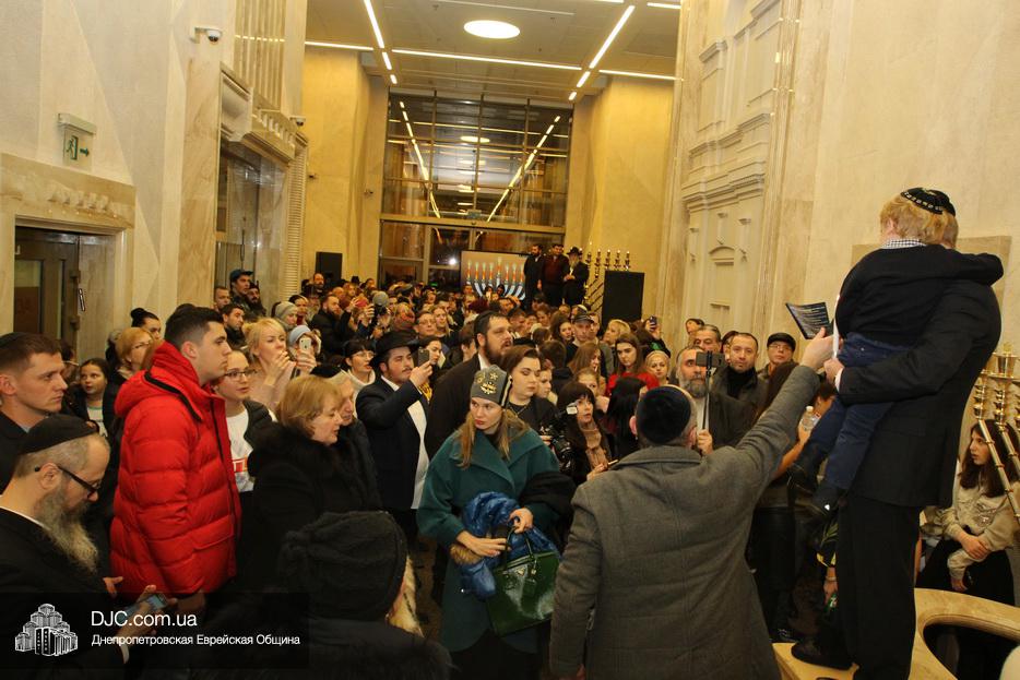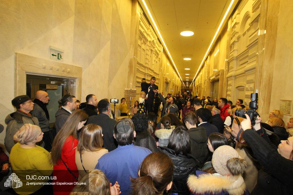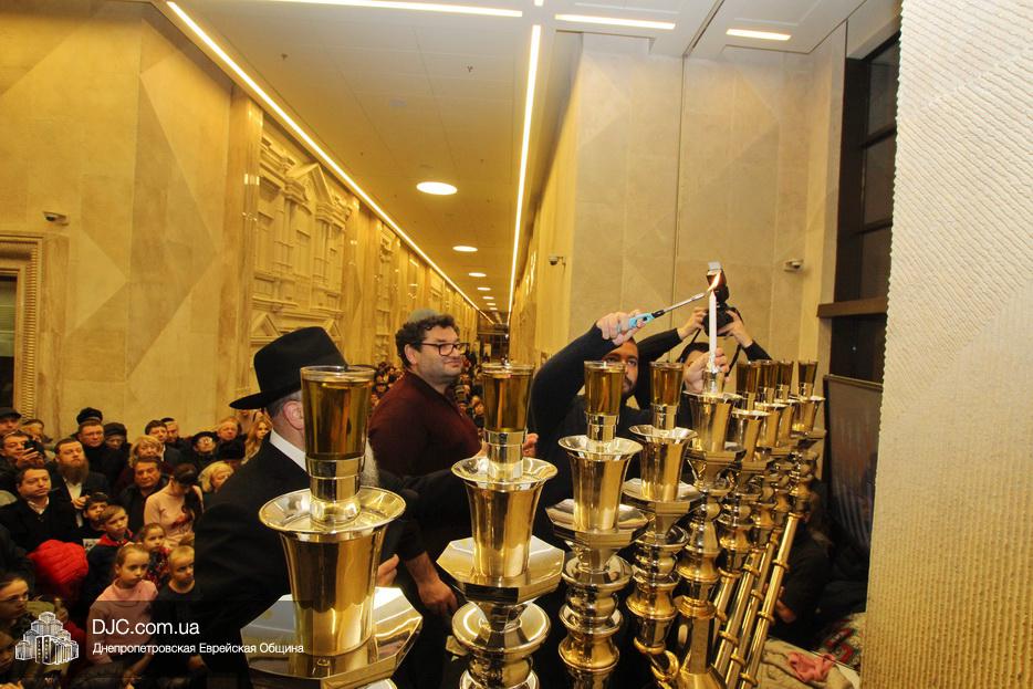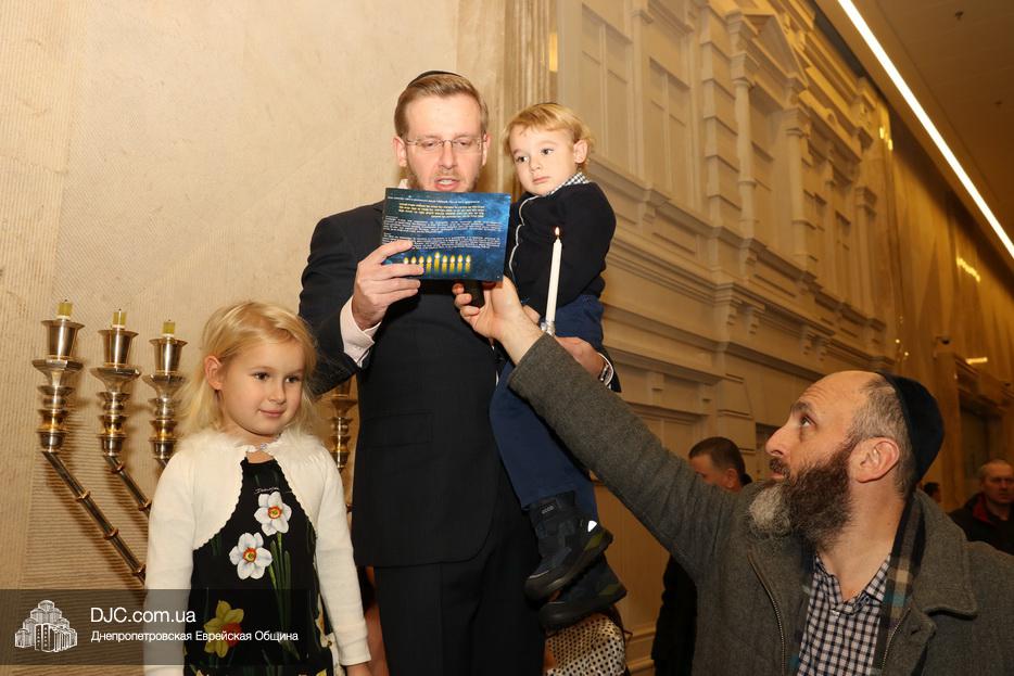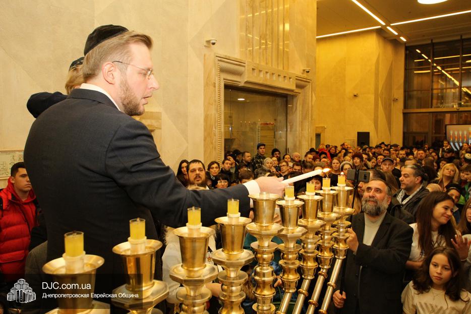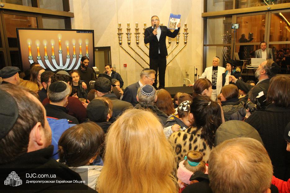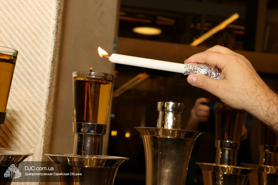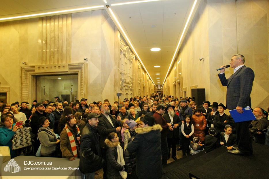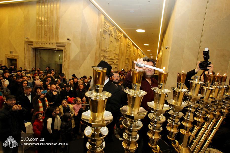 Перед церемонией зажжения еврейскую общину Днепра тепло поприветствовал Главный раввин Днепра и региона Шмуэль Каминецкий, который представил и рассказал о заслугах человека, которому предоставлена честь от имени всей общины выполнить эту важнейшую миссию – члена Попечительского Совета еврейской общины Днепра, господина Вадима Владимировича Ермолаева, который исполнил эту заповедь вместе со своим сыном Артуром (Борухом).