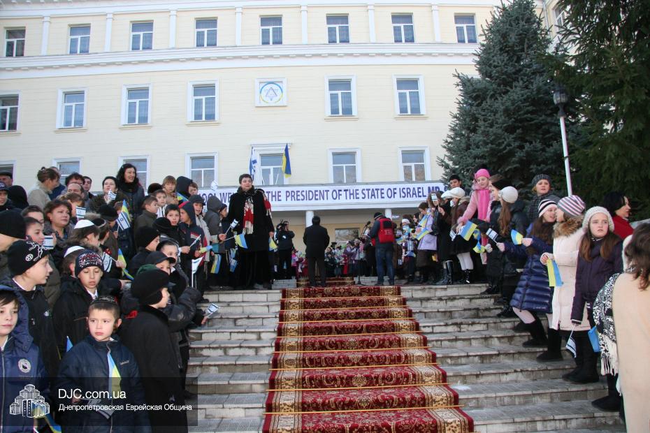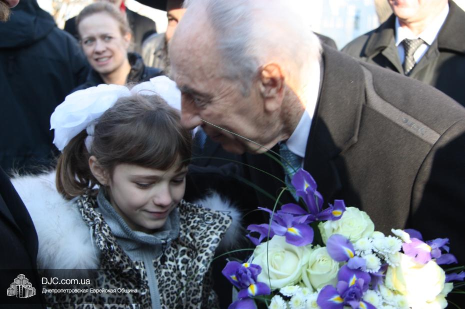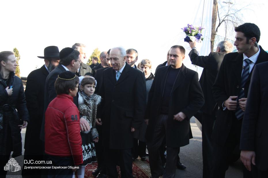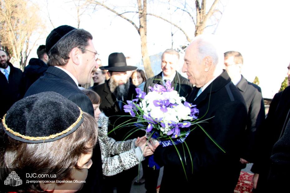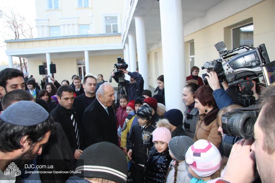 Пока Президент подымался по ступеням к школьному зданию, дети, стоя на ступенях и террасе перед фасадом, с энтузиазмом пели «Гевейну Шалом Алейхем», размахивали украинскими и израильскими флажками и радушно приветствовали Президента Израиля. Шимон Перес с видимым удовольствием общался с детьми, пожимал им руки, и было очевидно, что его растрогала такая искренняя и теплая встреча.
