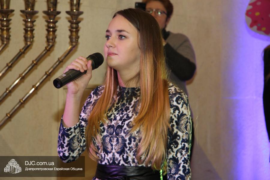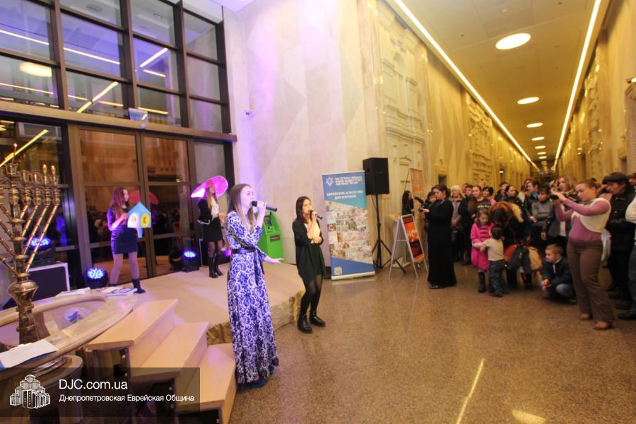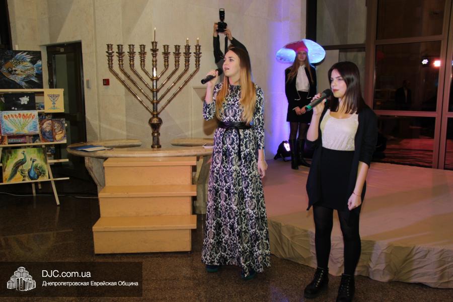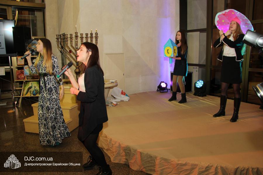 Затем все получили возможность угоститься пончиками, приготовленными рестораном центра «Менора», а ведущий мероприятия, известный шоумен и певец Яков Роговой, пригласил на сцену участниц молодежного клуба ЕА «Сохнут-Украина», подготовивших выступление на тему Хануки.