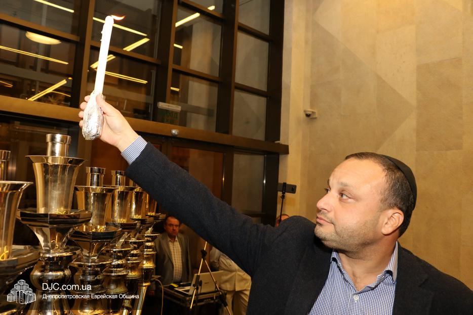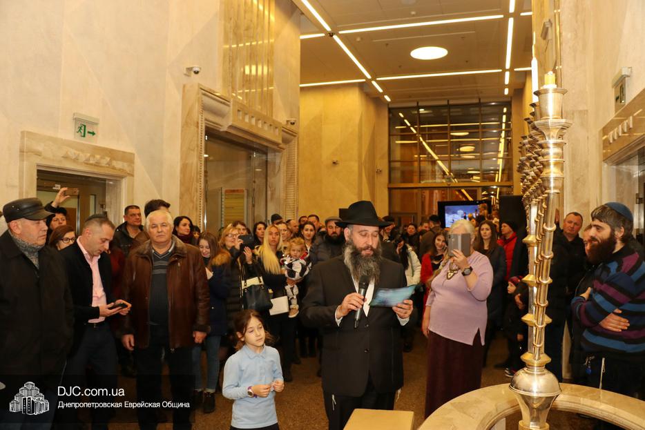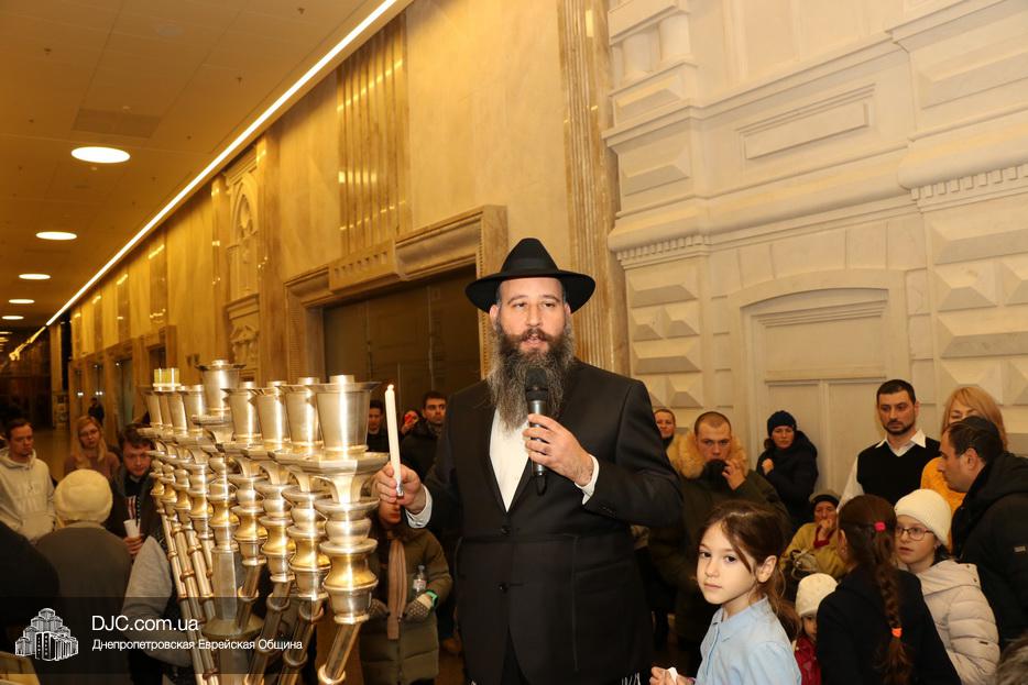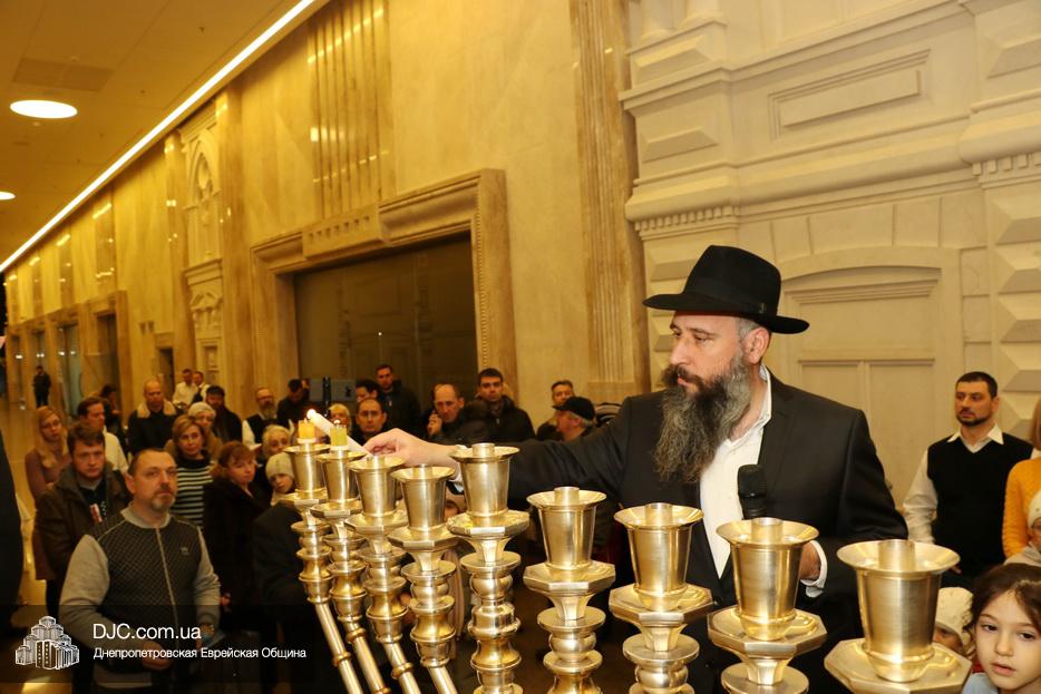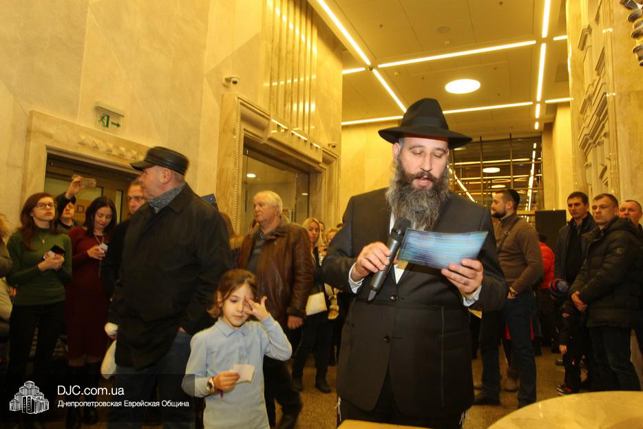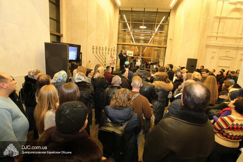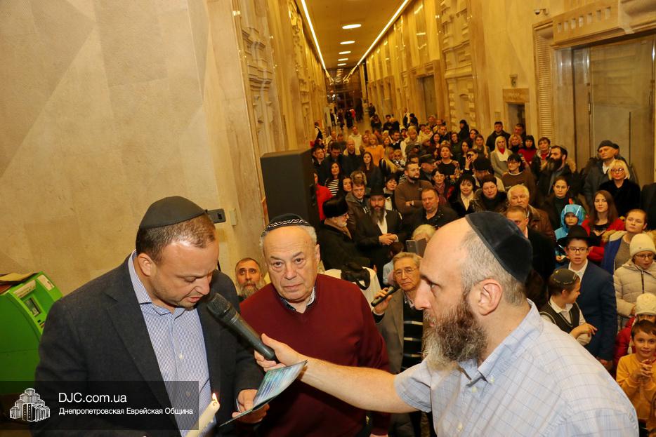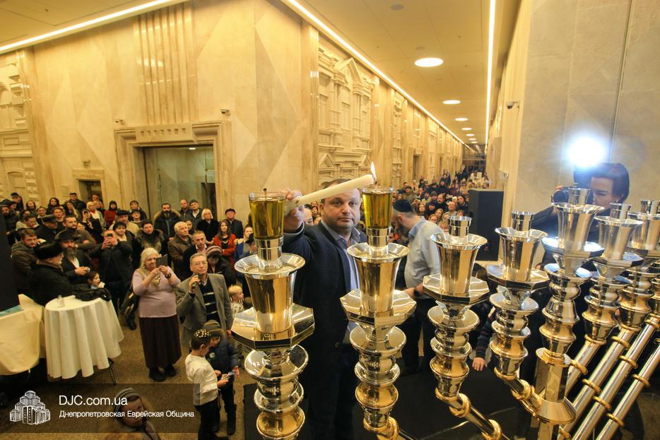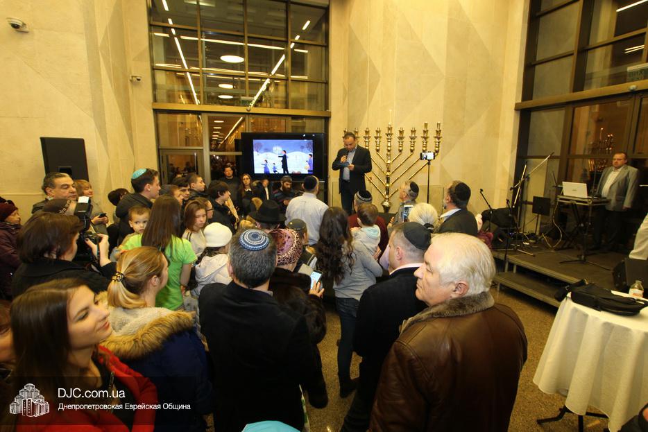 Перед церемонией зажжения, еврейскую общину Днепра тепло поприветствовал Второй секретарь Посольства государства Израиль в Украине, директор Израильского Культурного Центра «Натив», господин Вячеслав Смоткин. А затем честь зажечь свечи на большой серебряной ханукие, занесенной в «Книгу рекордов Гинесса», была предоставлена члену Попечительского Совета еврейской общины Днепра, господину Давиду Шульману, который исполнил эту заповедь вместе со своим отцом реб Борухом.