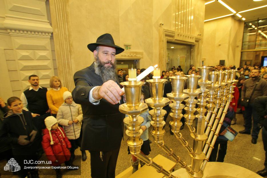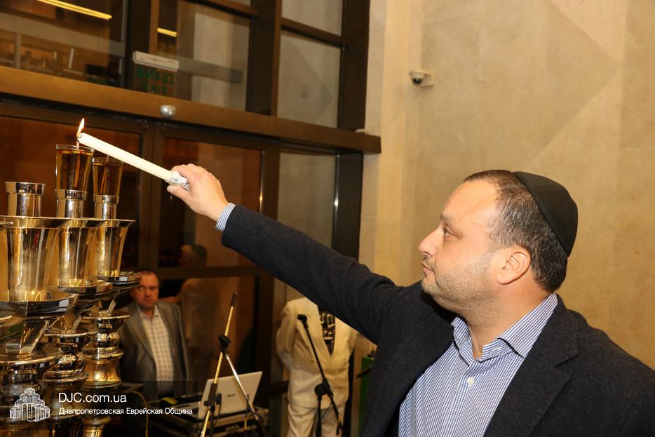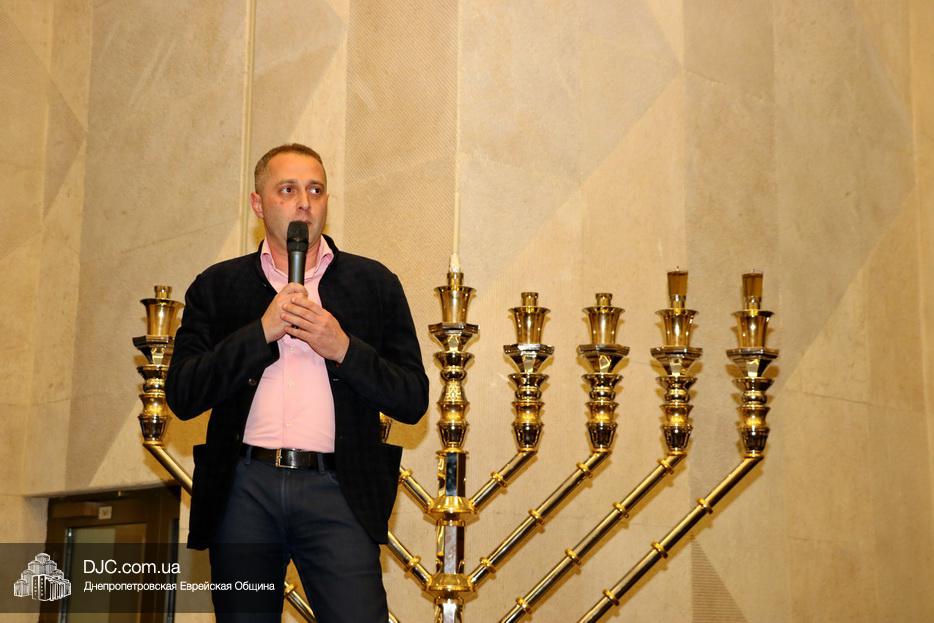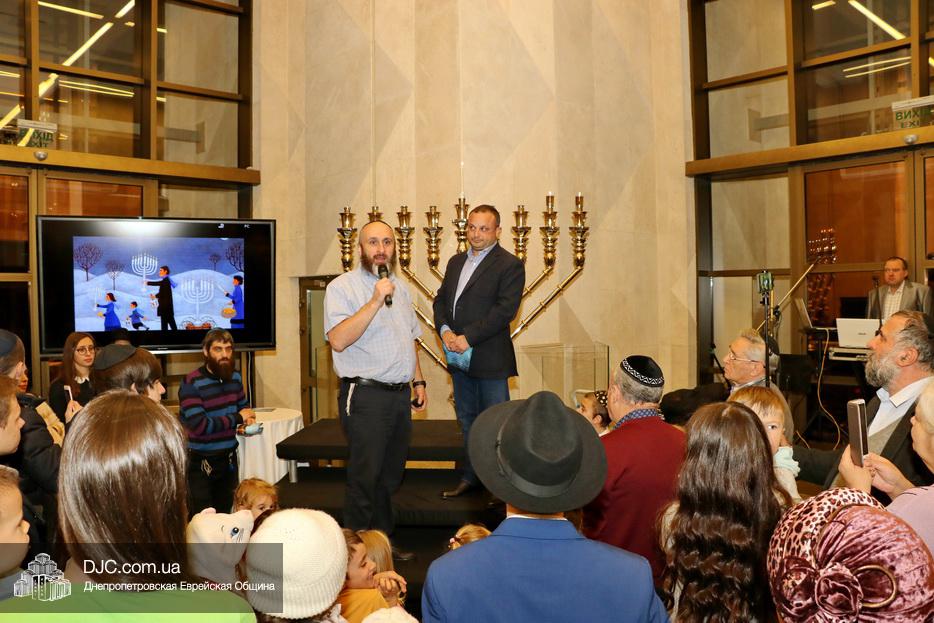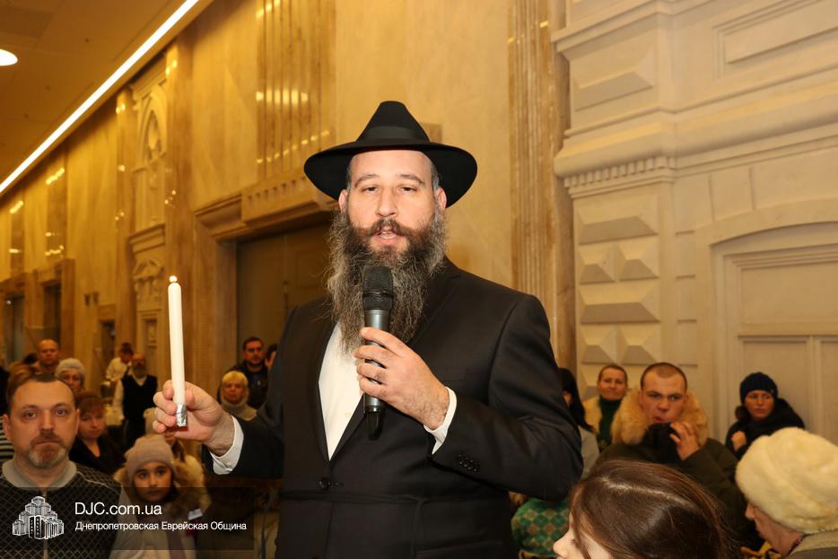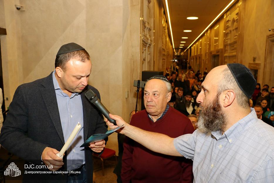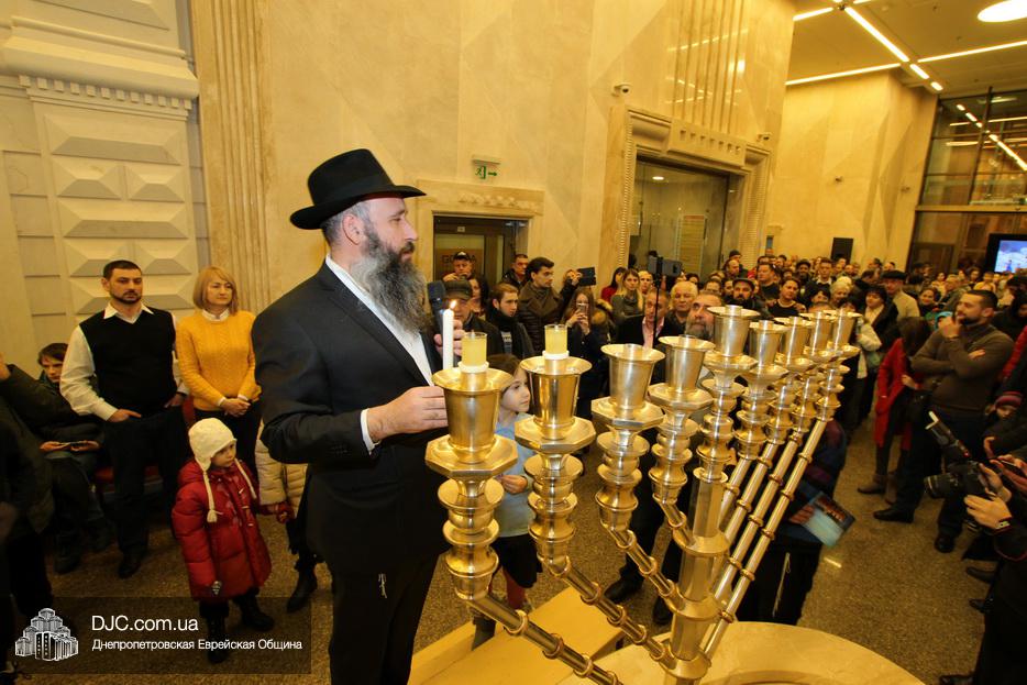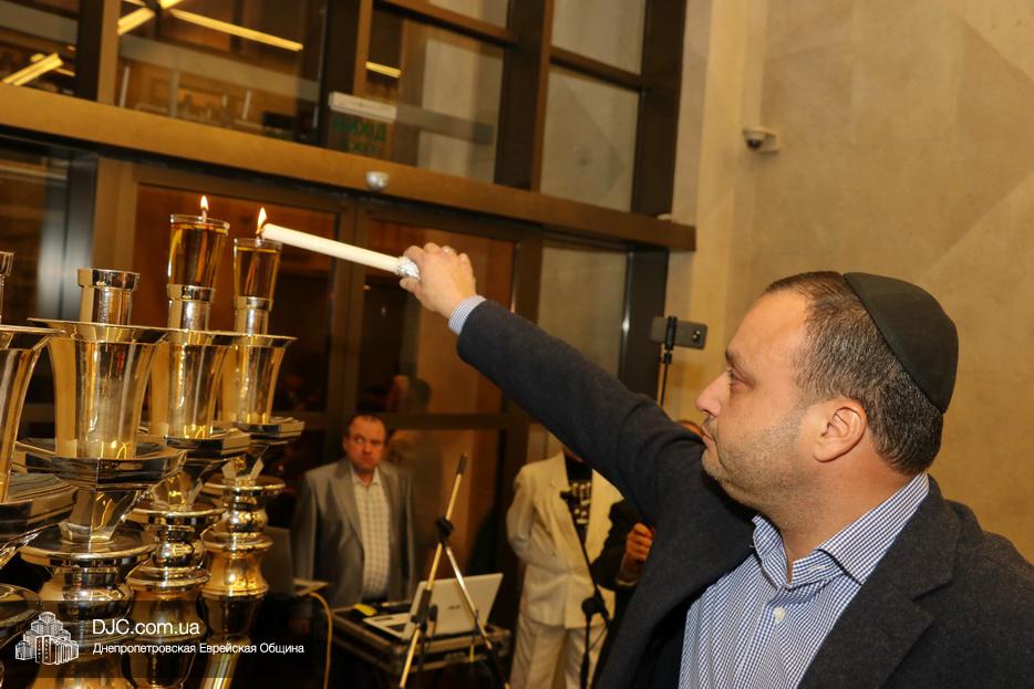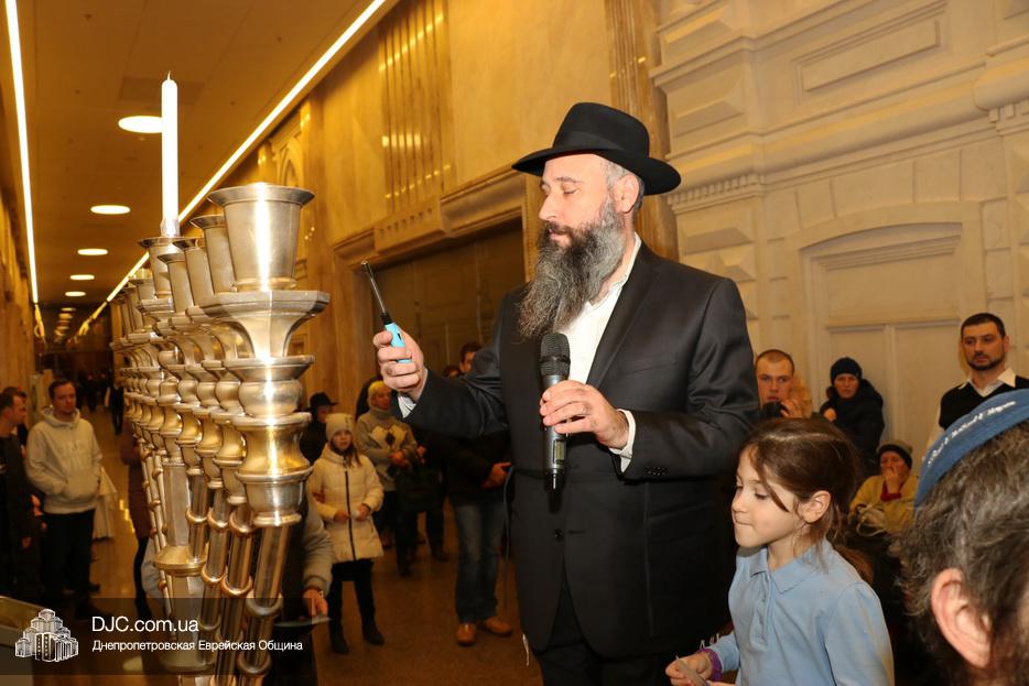 Перед церемонией зажжения, еврейскую общину Днепра тепло поприветствовал Второй секретарь Посольства государства Израиль в Украине, директор Израильского Культурного Центра «Натив», господин Вячеслав Смоткин. А затем честь зажечь свечи на большой серебряной ханукие, занесенной в «Книгу рекордов Гинесса», была предоставлена члену Попечительского Совета еврейской общины Днепра, господину Давиду Шульману, который исполнил эту заповедь вместе со своим отцом реб Борухом.