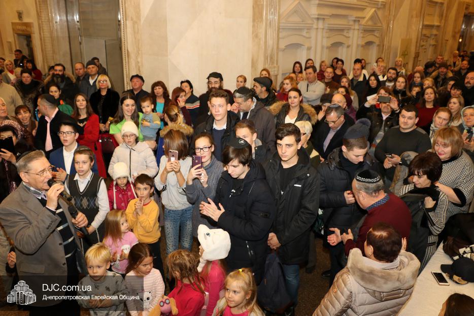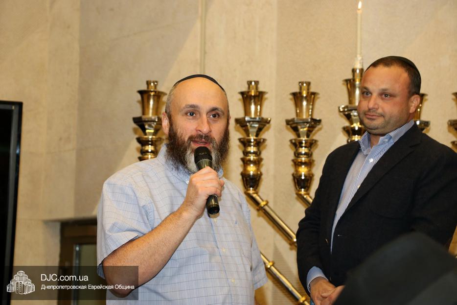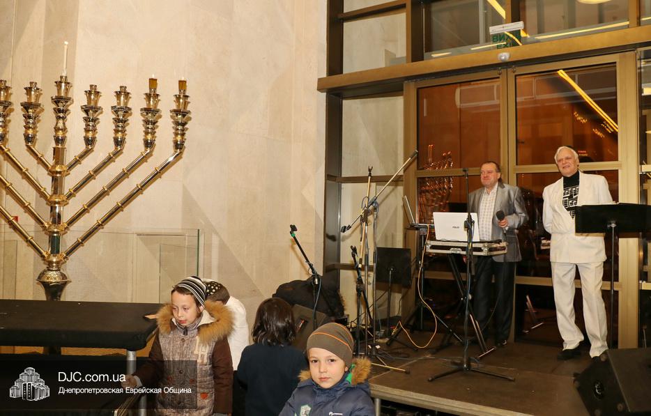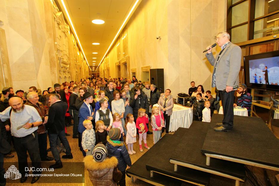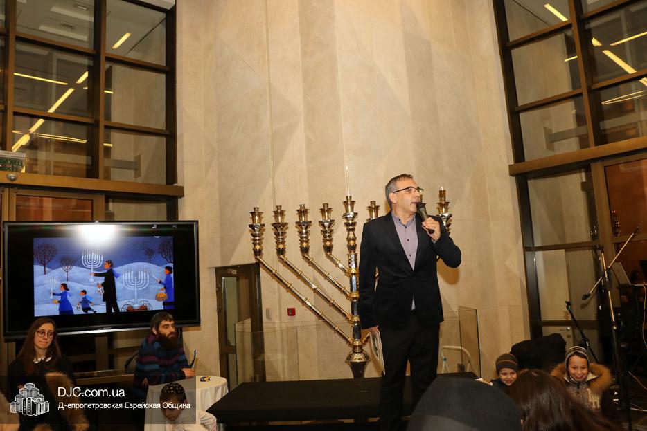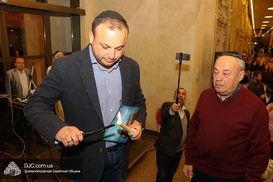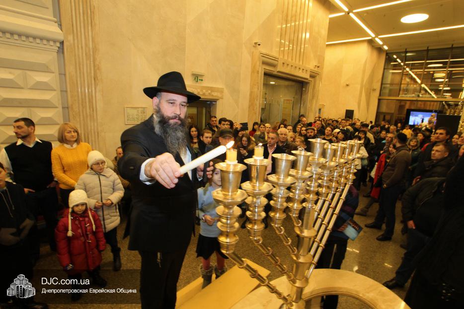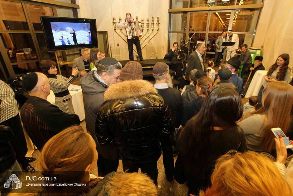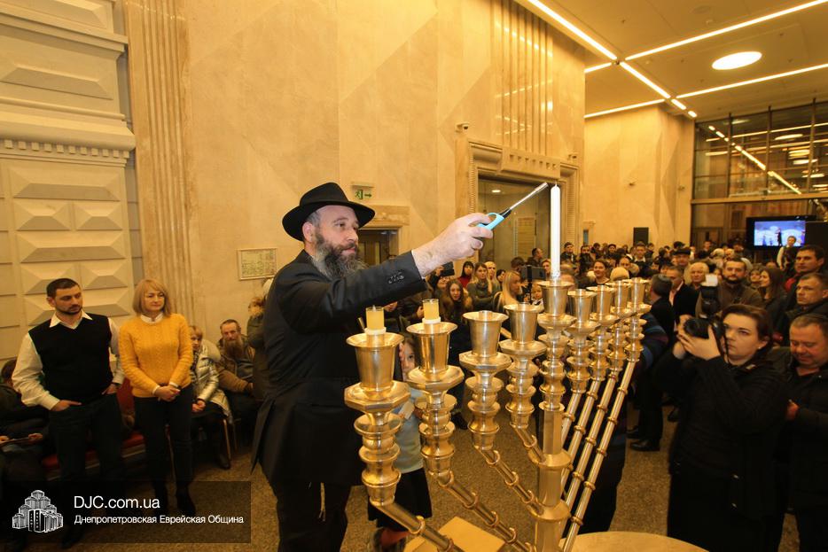 Перед церемонией зажжения, еврейскую общину Днепра тепло поприветствовал Второй секретарь Посольства государства Израиль в Украине, директор Израильского Культурного Центра «Натив», господин Вячеслав Смоткин. А затем честь зажечь свечи на большой серебряной ханукие, занесенной в «Книгу рекордов Гинесса», была предоставлена члену Попечительского Совета еврейской общины Днепра, господину Давиду Шульману, который исполнил эту заповедь вместе со своим отцом реб Борухом.