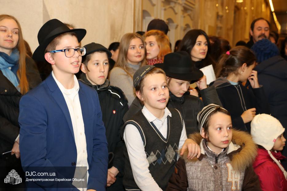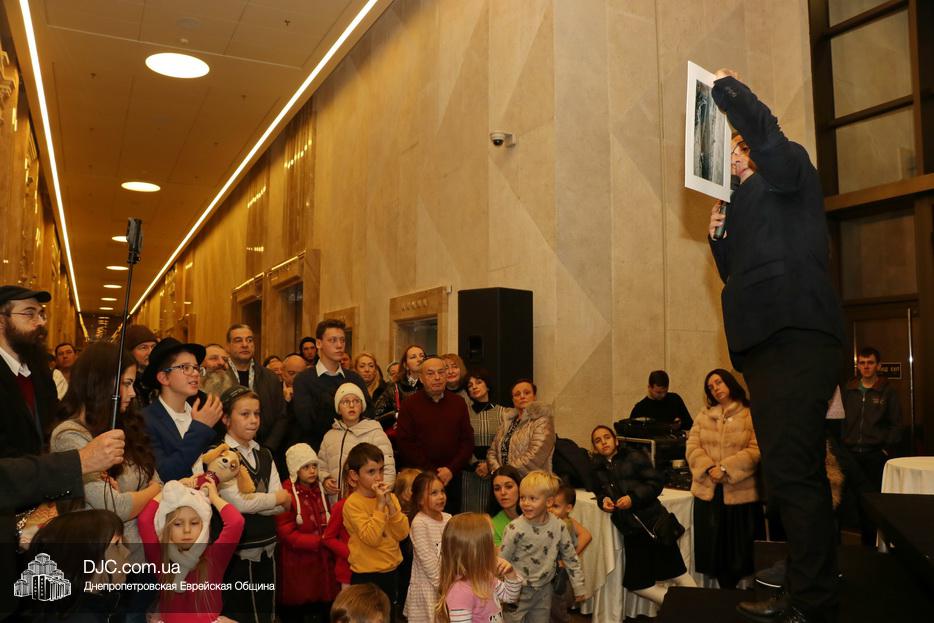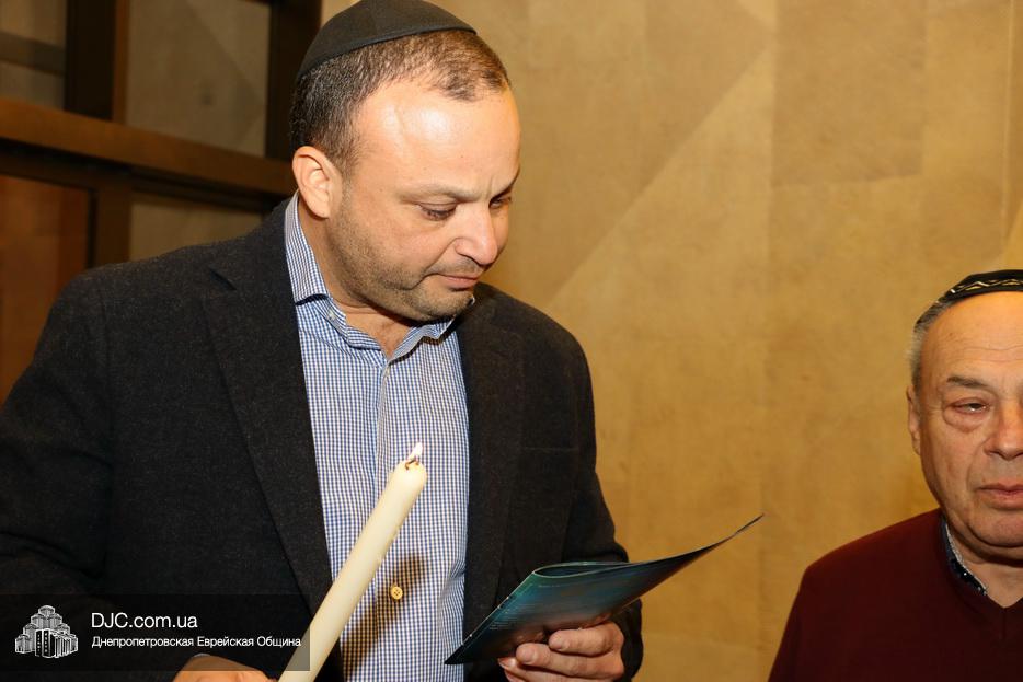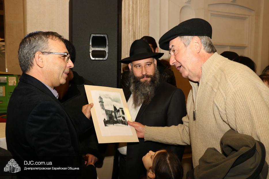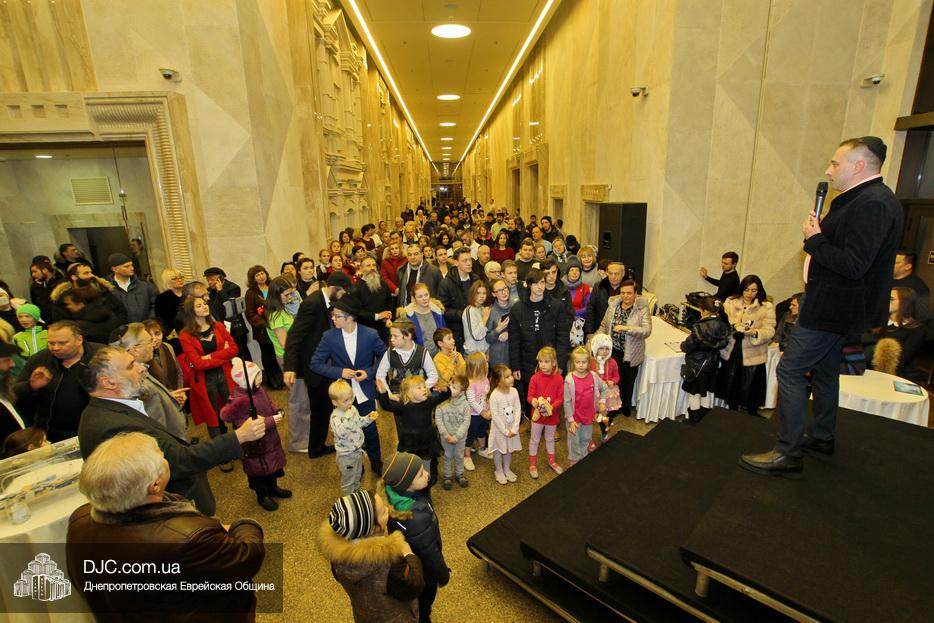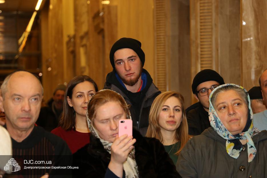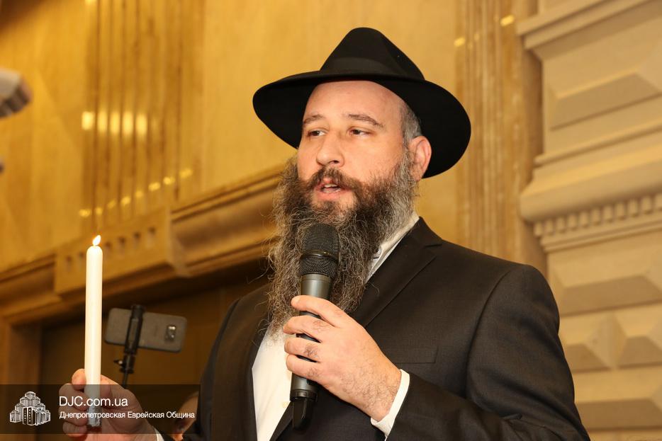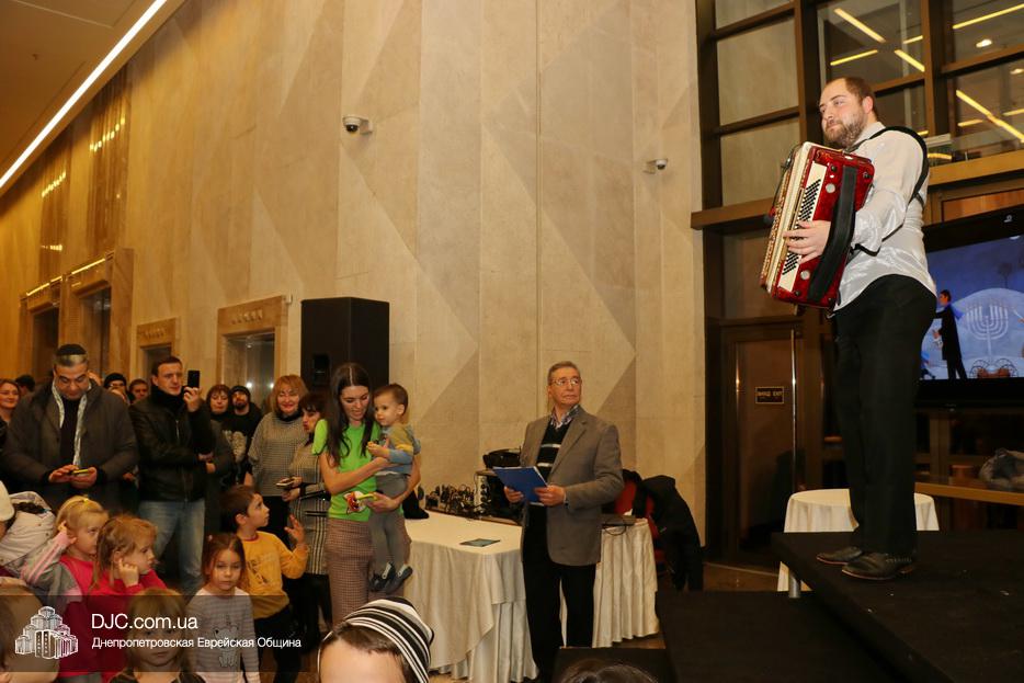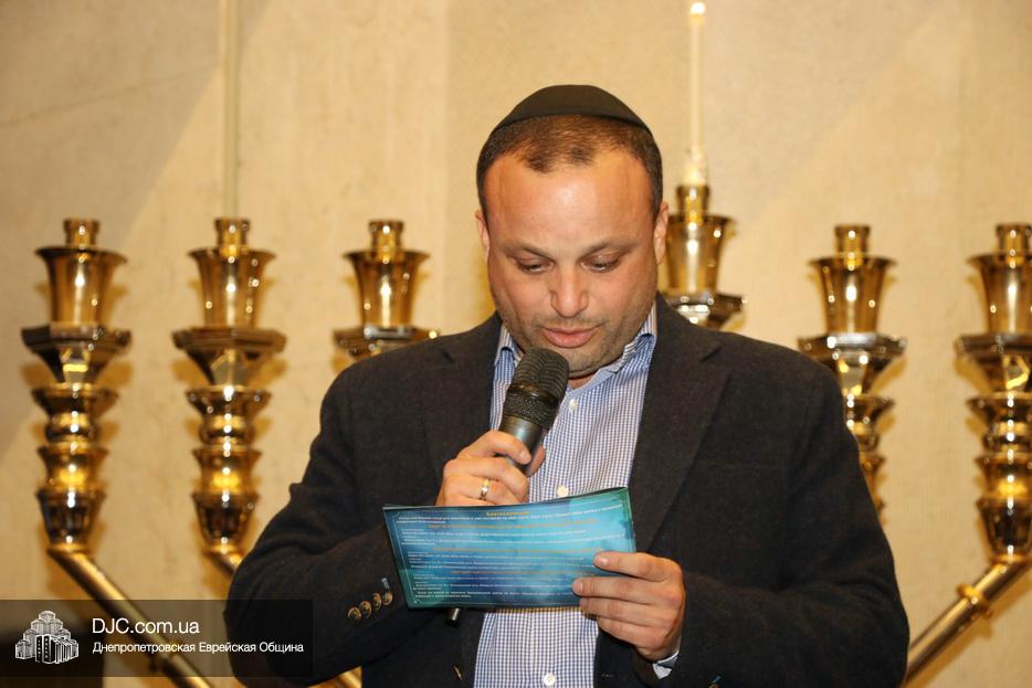 Перед церемонией зажжения, еврейскую общину Днепра тепло поприветствовал Второй секретарь Посольства государства Израиль в Украине, директор Израильского Культурного Центра «Натив», господин Вячеслав Смоткин. А затем честь зажечь свечи на большой серебряной ханукие, занесенной в «Книгу рекордов Гинесса», была предоставлена члену Попечительского Совета еврейской общины Днепра, господину Давиду Шульману, который исполнил эту заповедь вместе со своим отцом реб Борухом.