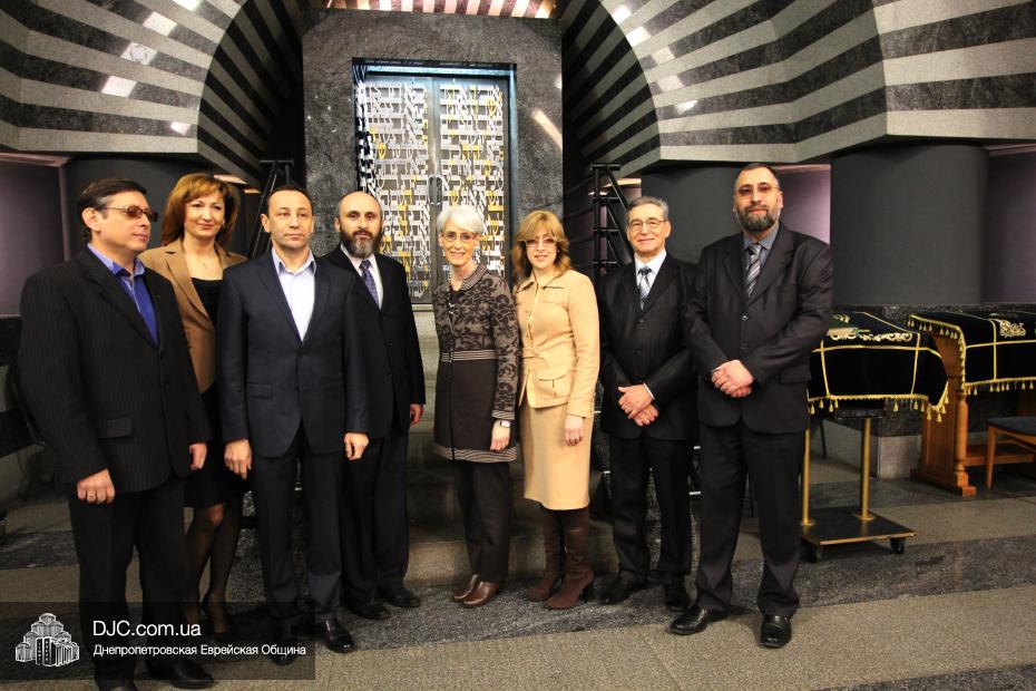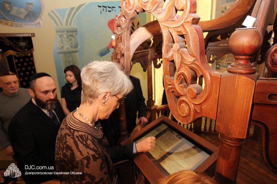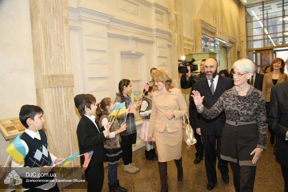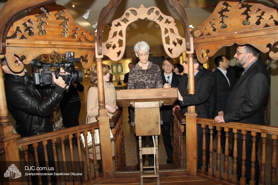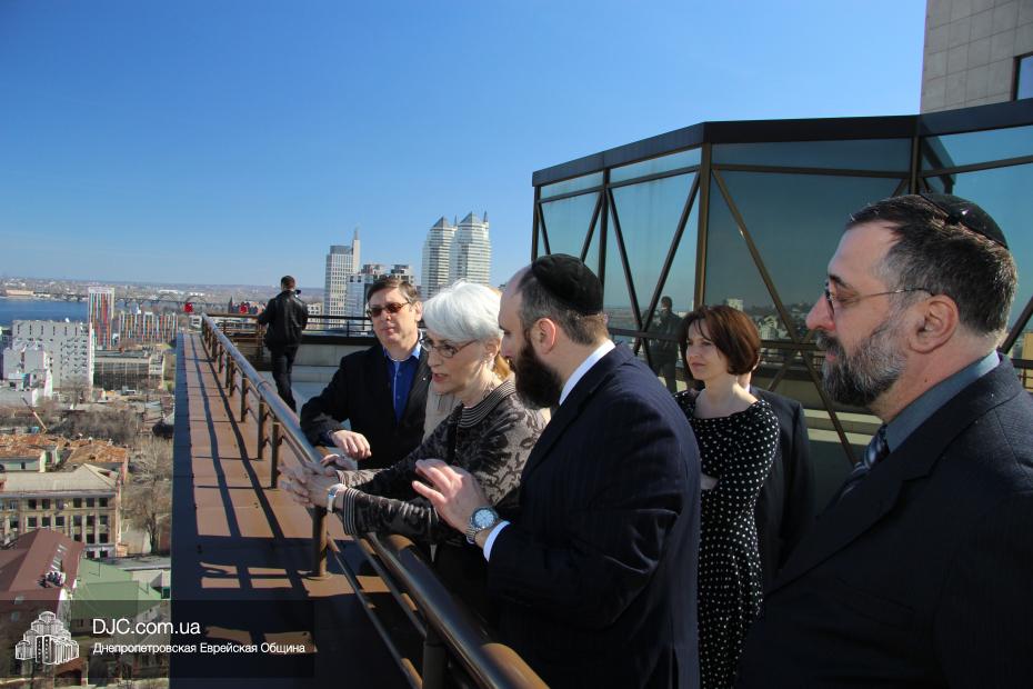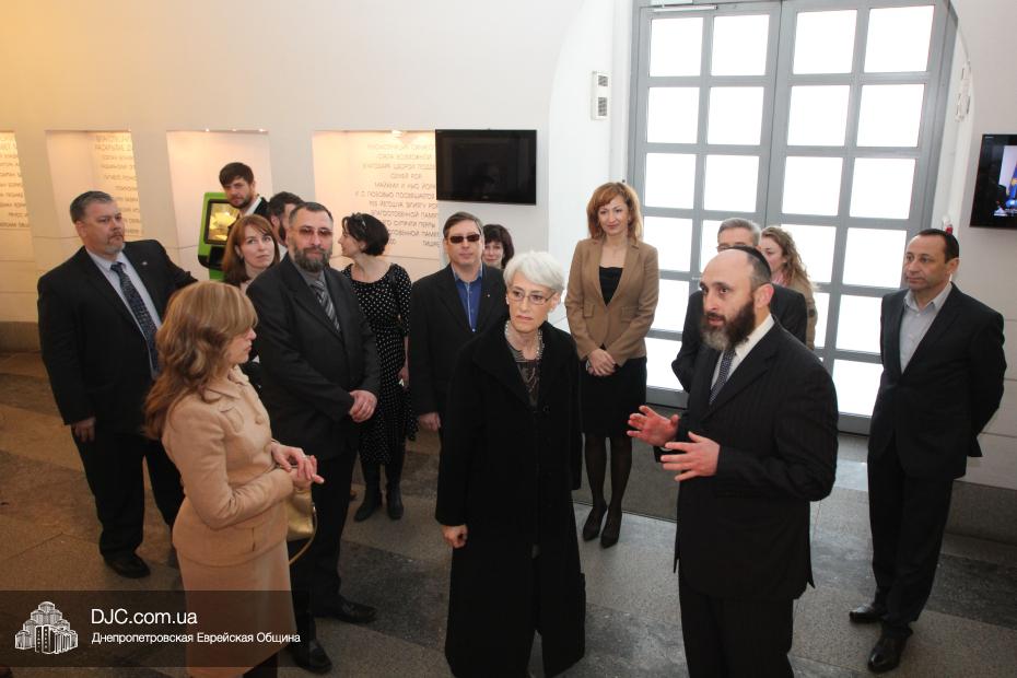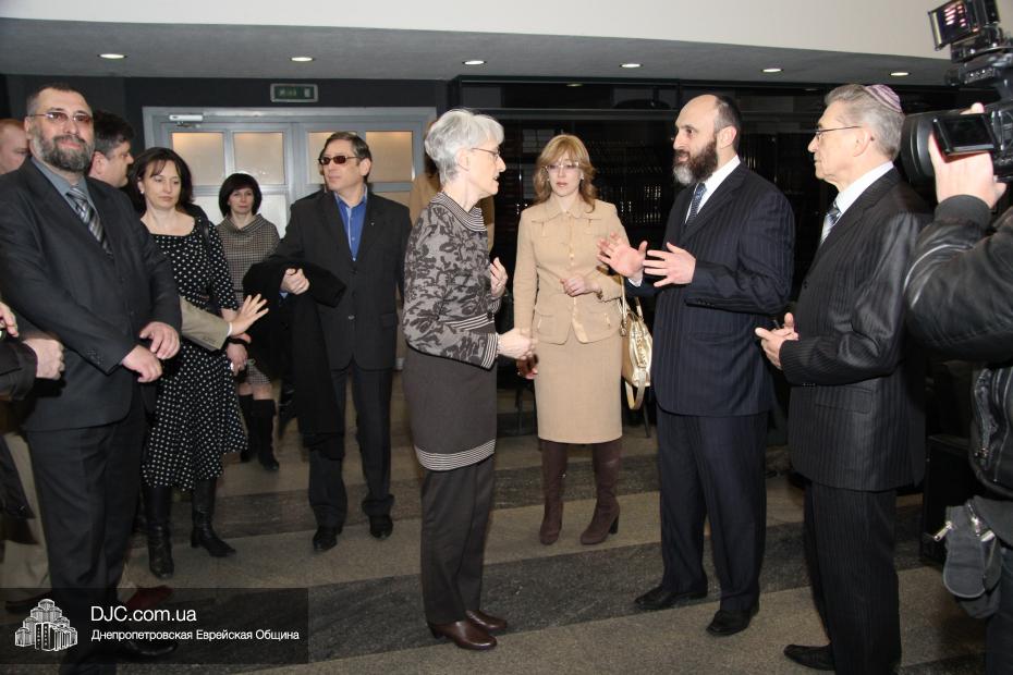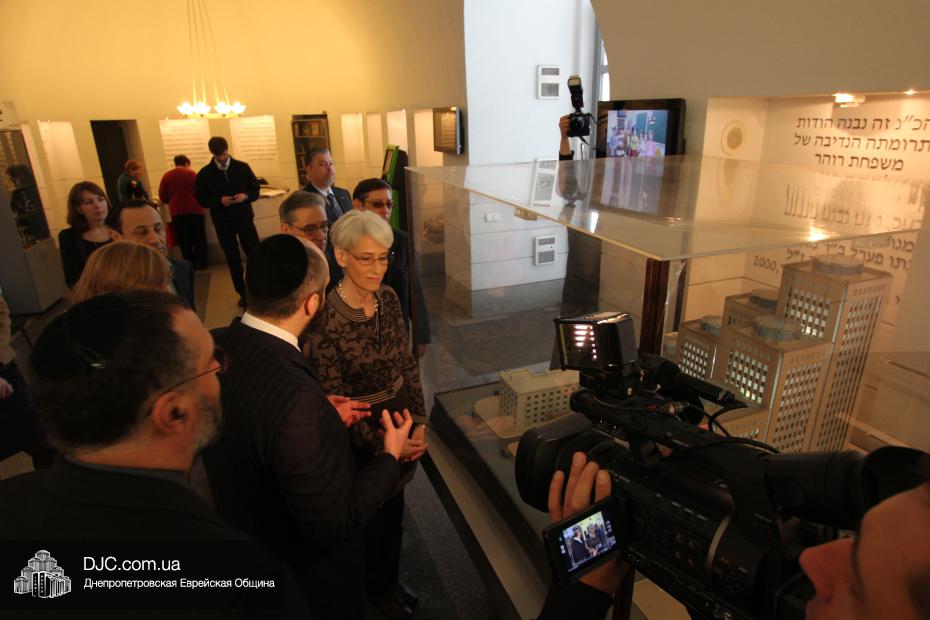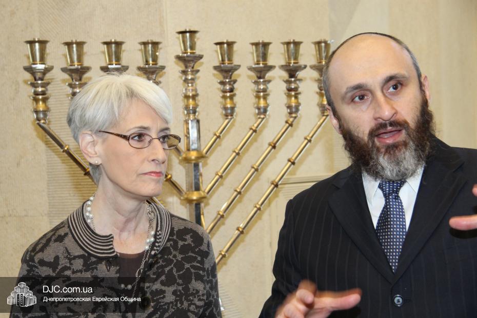 Директор еврейской общины Зелиг Брез рассказал госпоже Шерман об истории еврейской общины, еврейского возрождения, которое началось с приездом посланников Любавического Ребе раввина Шмуэля Каминецкого и его супруги Ханы, о том, как живет еврейская община Днепропетровска. Госпожа Шерман осмотрела Центральную синагогу «Золотая Роза», крупнейший в мире еврейский центр «Менора» и музей «Память еврейского народа и Холокост в Украине».