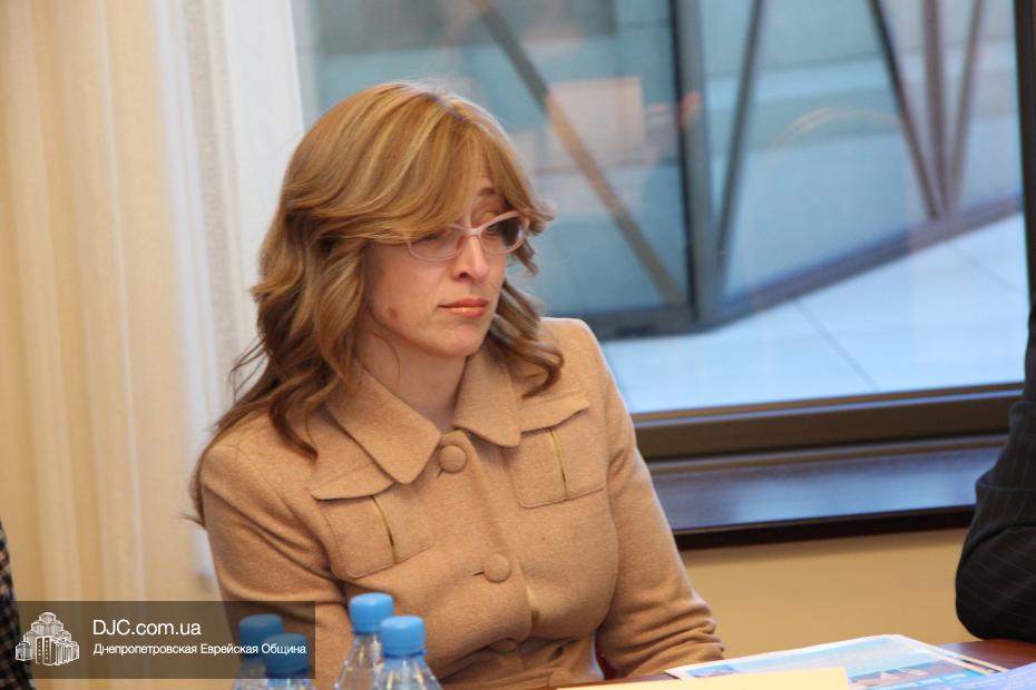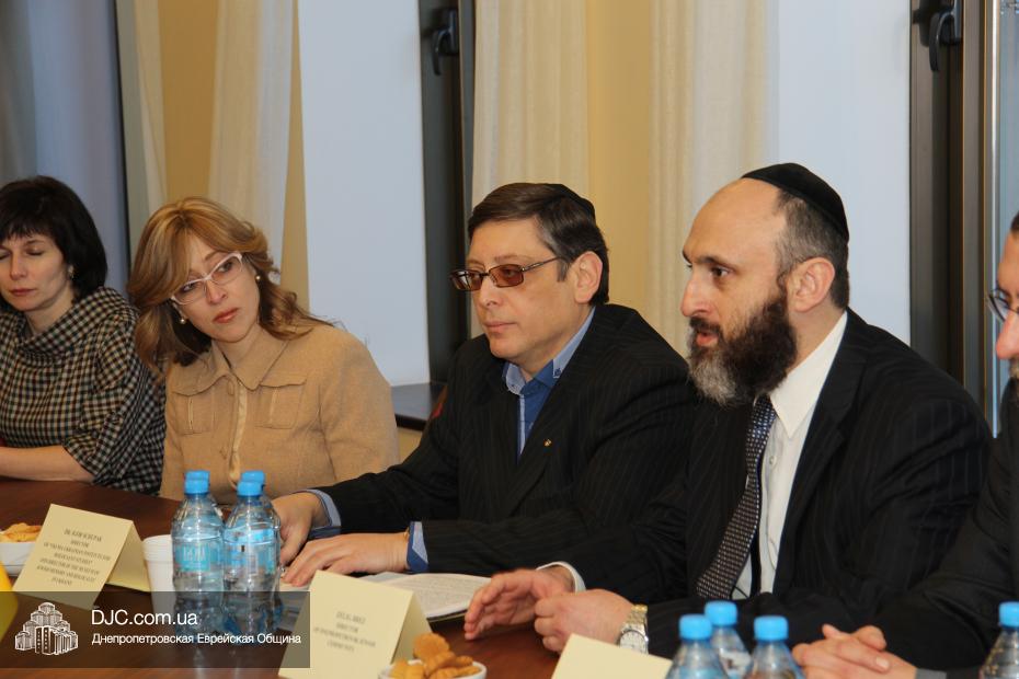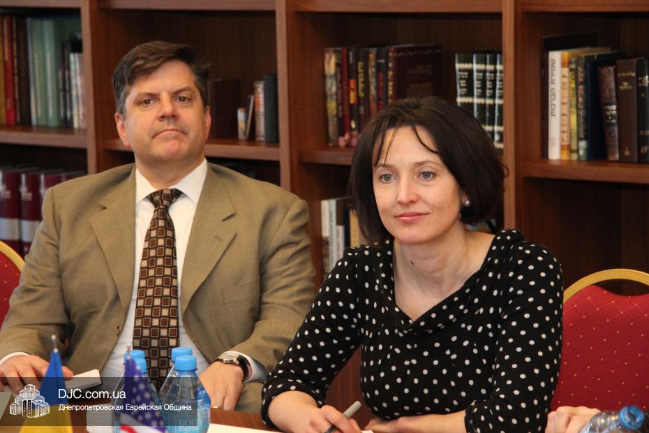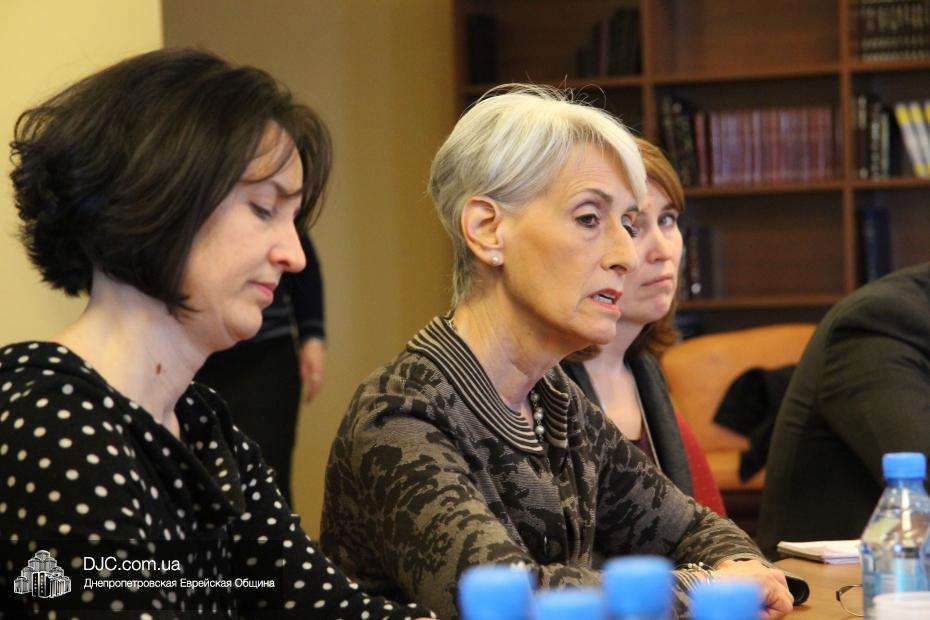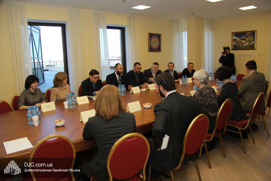 Затем состоялась беседа заместителя госсекретаря США Венди Шерман с еврейскими лидерами Днепропетровска. В этой встрече, которая проходила в конференц-зале на 18 этаже «Меноры», еврейскую общину представляли: Зелиг Брез, директор Благотворительного Фонда «Днепропетровская еврейская община», Олег Ростовцев, член правления Днепропетровской еврейской общины, руководитель информационного департамента общины, Игорь Щупак, директор УИИХ «Ткума» и музея «Память еврейского народа и Холокост в Украине», ребецн Хана Каминецкая, а также Александр Фридкис, управляющий делами еврейской религиозной общины, Игорь Романов, исполнительный директор «Объединения иудейских религиозных общин Днепропетровского региона», Ян Сидельковский, координатор «Кегила-проджекта» Днепропетровской и Бостонской еврейских общин, и Нелла Горинова, руководитель аппарата Главного раввина Днепропетровска.