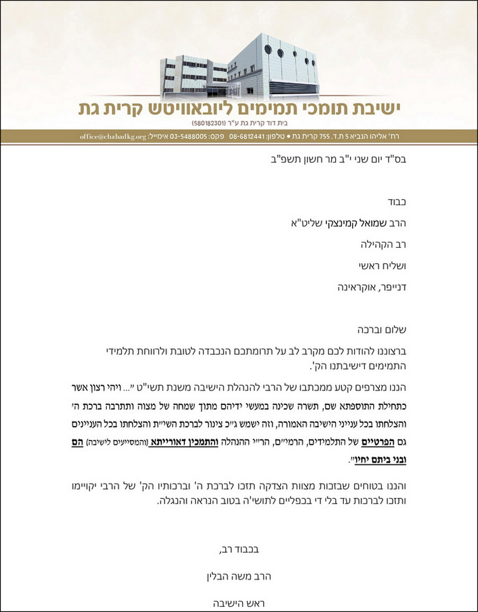 Иешива Кирьят-Гата (Израиль) направила благодарственное письмо в адрес Еврейской общины Днепра и лично Главного раввина Шмуэля Каминецкого за помощь и поддержку в их деятельности.