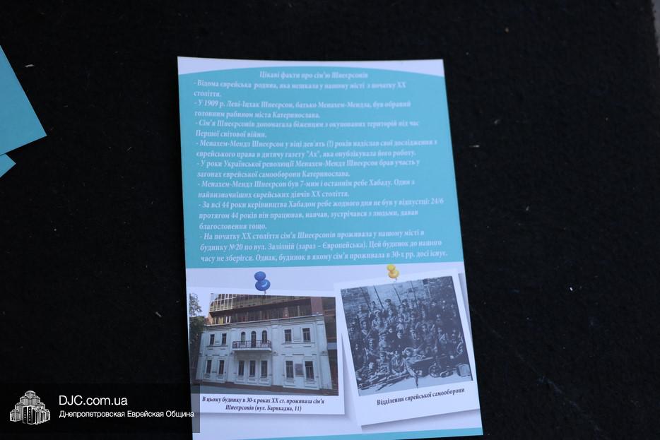 «Институт истории Днепра», подразделение КП «Агентство розвитку Дніпра», проводит серию акций по разъяснению горожанам новой топонимики города и знакомит жителей с теми историческими личностями, чьи имена теперь носят «декоммунизированные» улицы. В этот раз просветительская акция прошла в районе улицы Менахема-Мендела Шнеерсона (бывшая Сергея Минина).