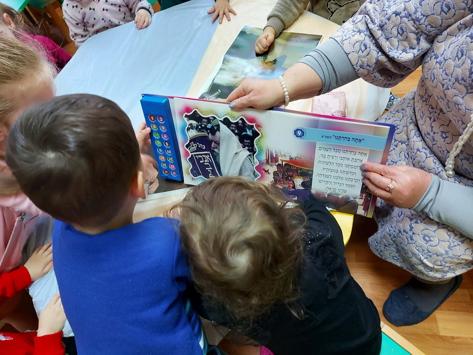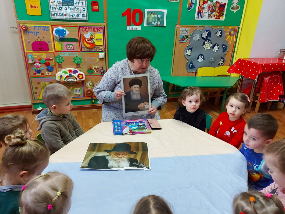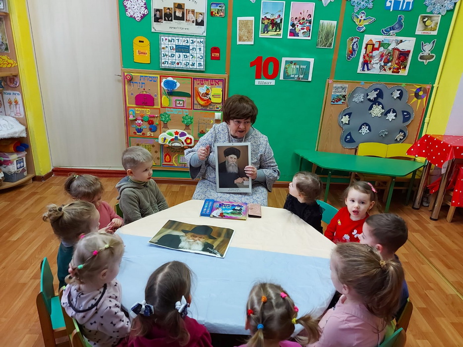 Преподаватель еврейских традиций Рахель Виноградова рассказывала нашим малышам о Шестом Любавическом Ребе Иосифе-Ицхаке Шнеерсоне и о Седьмом Любавическом Ребе Менахеме-Менделе Шнеерсоне и они рассматривали их портреты.
