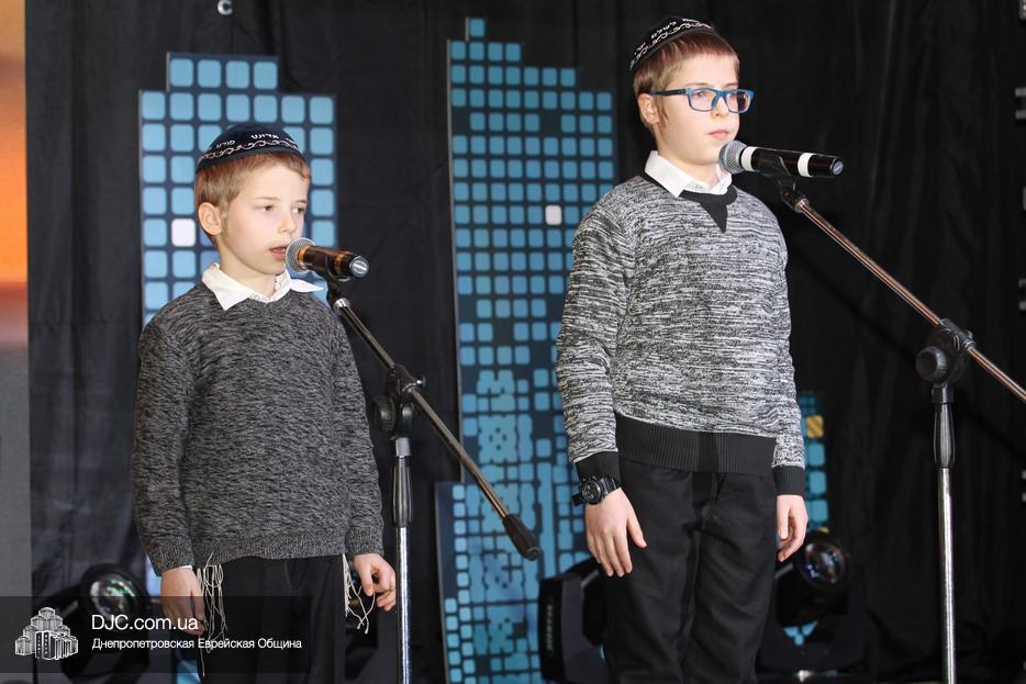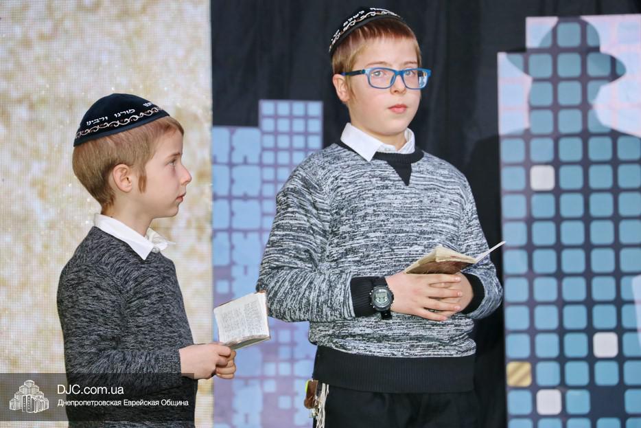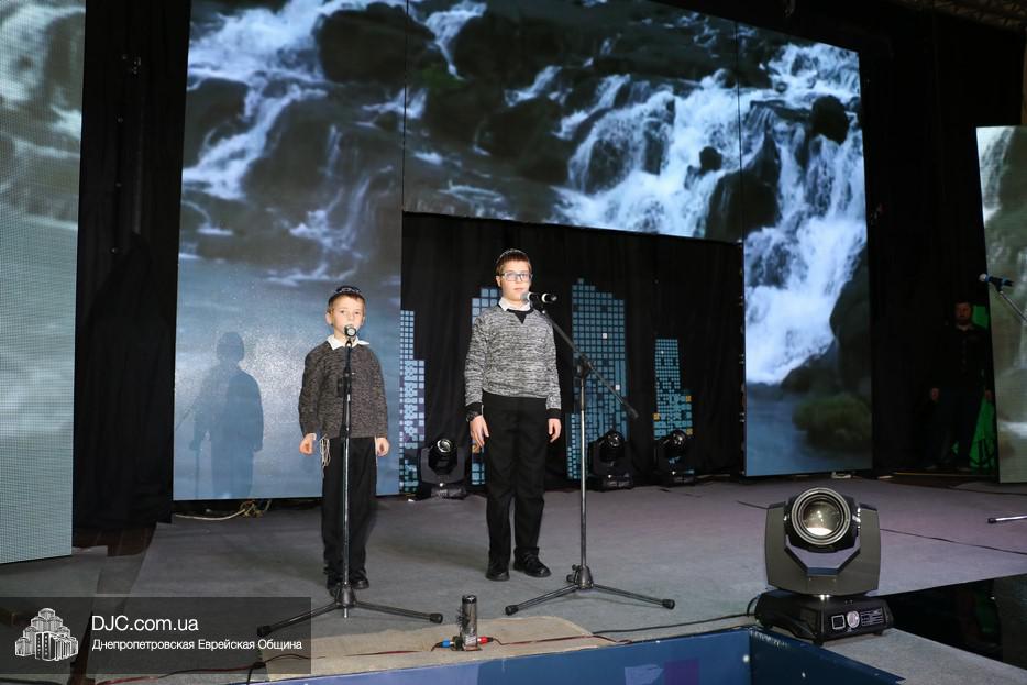 Образовательная часть началась с мультимедиа. (Вообще надо отметить весьма высокую насыщенность праздника всякими технологическими фишками – тут и мультиэкран, и летающие краны, и Q-код для регистрации в on-line сервисах для интерактивного голосования, и многое другое.) Видео рассказало о том, как Ребе впервые произнес первый из серии своих знаменитых маамаров «Боси ле Гани», основанных на маамарах Предыдущего Ребе, и том, как именно он принял на себя великую миссию Главы поколения. И как неразрывная связь времен, архивная запись перешла в реальность, и два юных голоса подхватили маамар, и это произвело глубокое впечатление на каждого присутствовавшего. Еще не было сказано кто эти дети, и почему они сегодня вышли на сцену, но было уже понятно, что происходит особое совмещение пространства и времени.