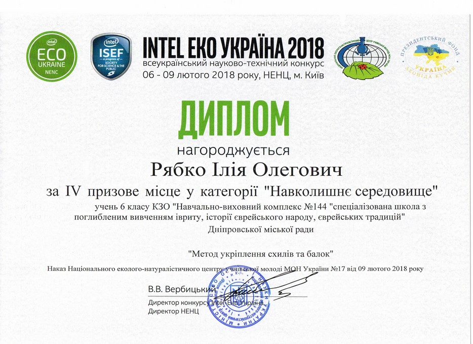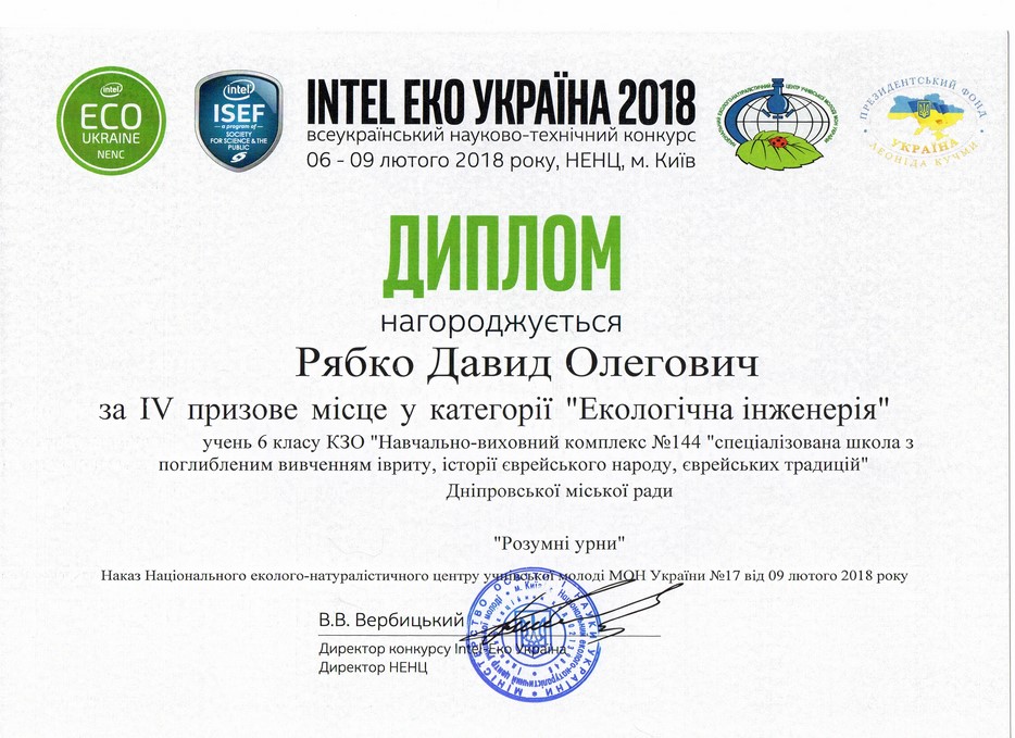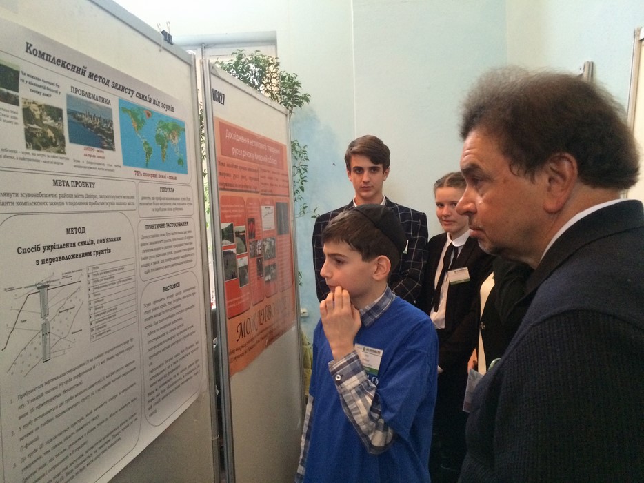 Об этом конкурсе наш сайт уже писал и приводил примеры весьма необычных, а иногда и забавных научных идей, разработок и тем исследований. Сто шестьдесят восемь самых-самых были выбраны для финала, который прошел в начале февраля в Киеве, и ученики 6-а класса еврейской школы Днепра, под руководством учителя Ольги Борисенко, заняли престижные, хотя и не призовые четвертые места – Давид Рябко в категории «Экологическая инженерия» с проектом «Умная урна», Илья Рябко в категории «Окружающая среда» с проектом «Метод укрепления склонов и балок».