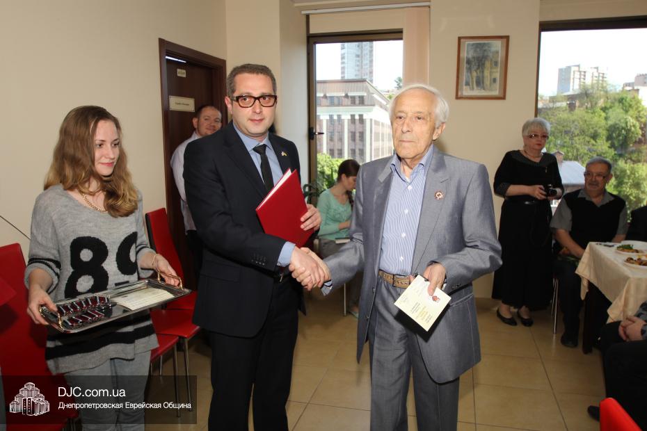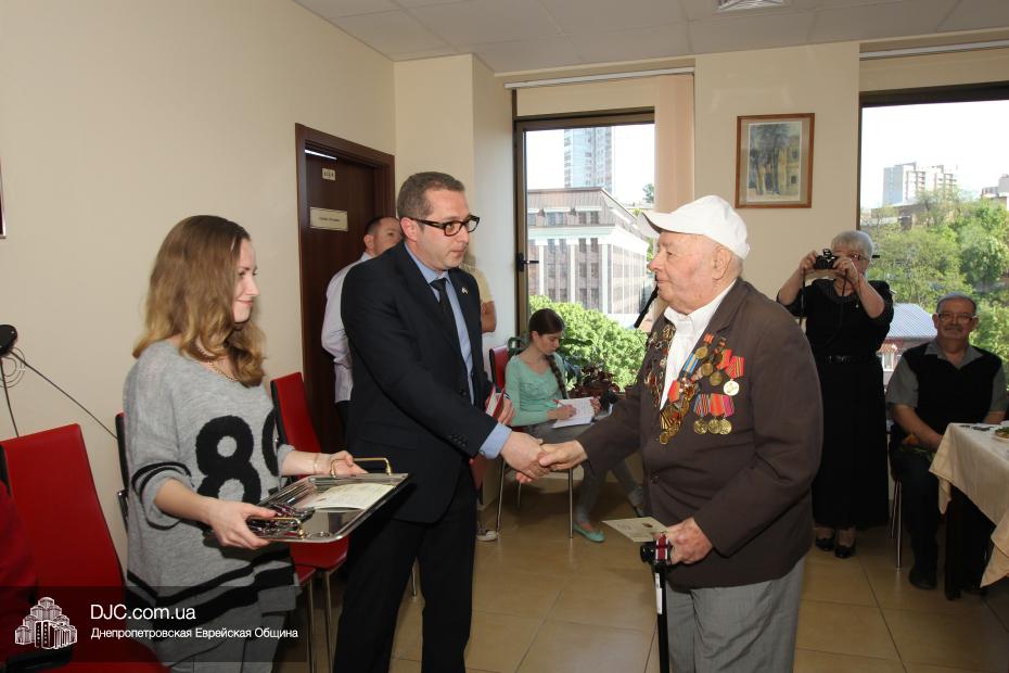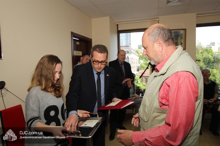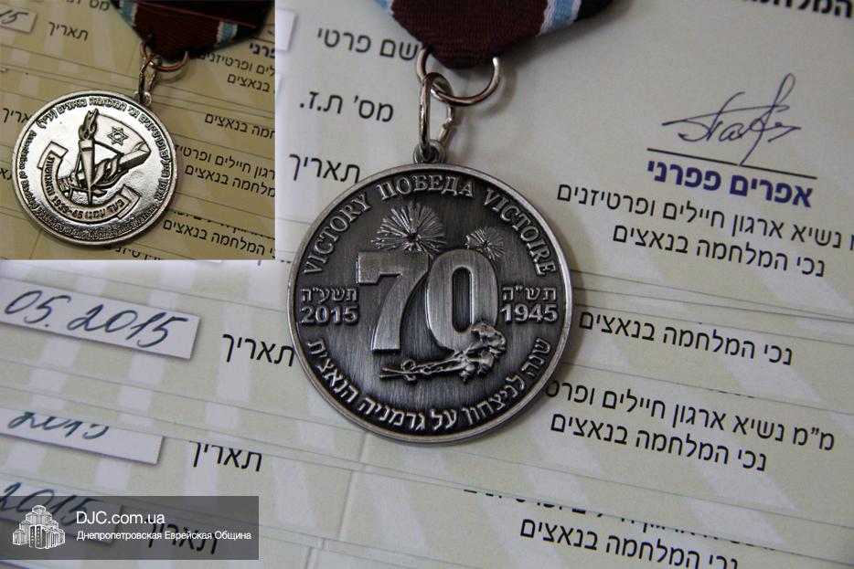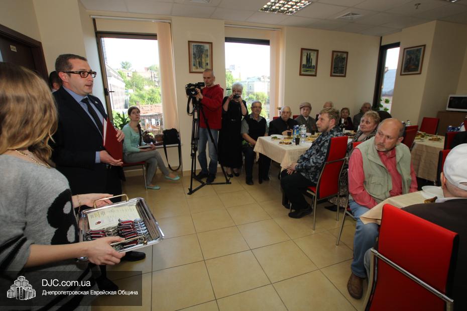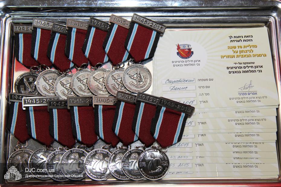 Вручение медалей государства Израиль провел Вячеслав Смоткин, второй секретарь Посольства государства Израиль в Украине, директор Центра Культуры Израиля. Он выразил искреннюю благодарность от имени государства Израиль и от себя лично каждому, кто спас мир от нацизма, кто одержал Победу, и благодаря кому нацизм был повержен. Специальной памятной медалью, учрежденной государством Израиль совместно с израильским Союзом солдат и партизан, инвалидов войны с нацизмом, в Днепропетровске было награждено 14 человек. Многие из награжденных пришли сами, других представляли близкие родственники.