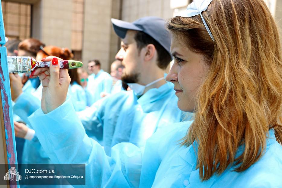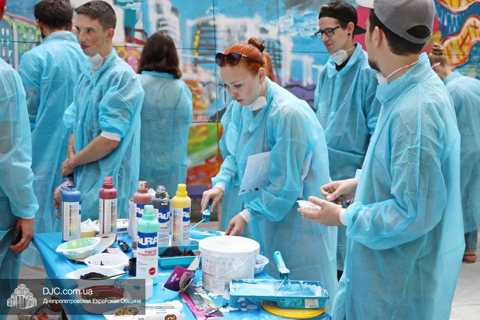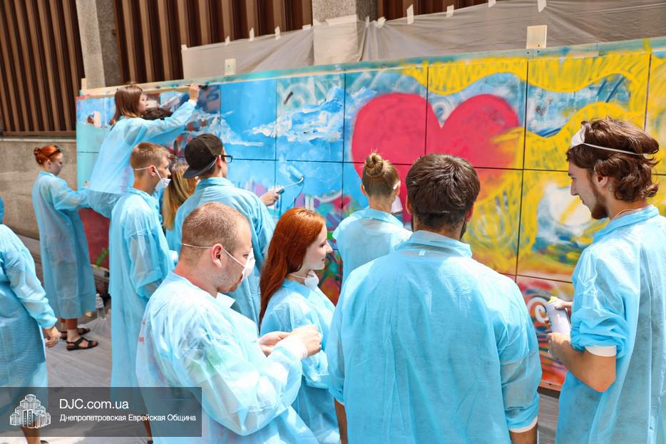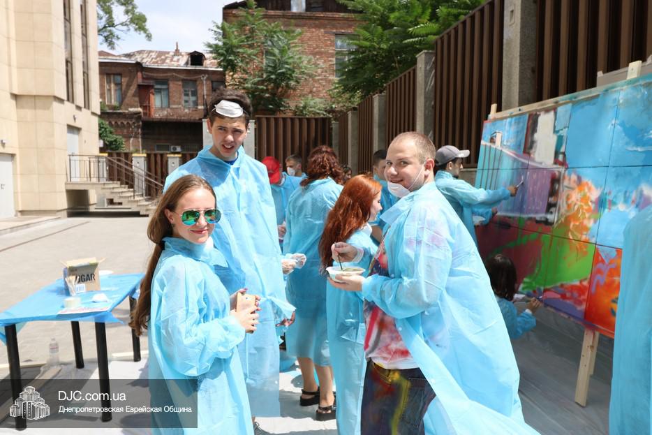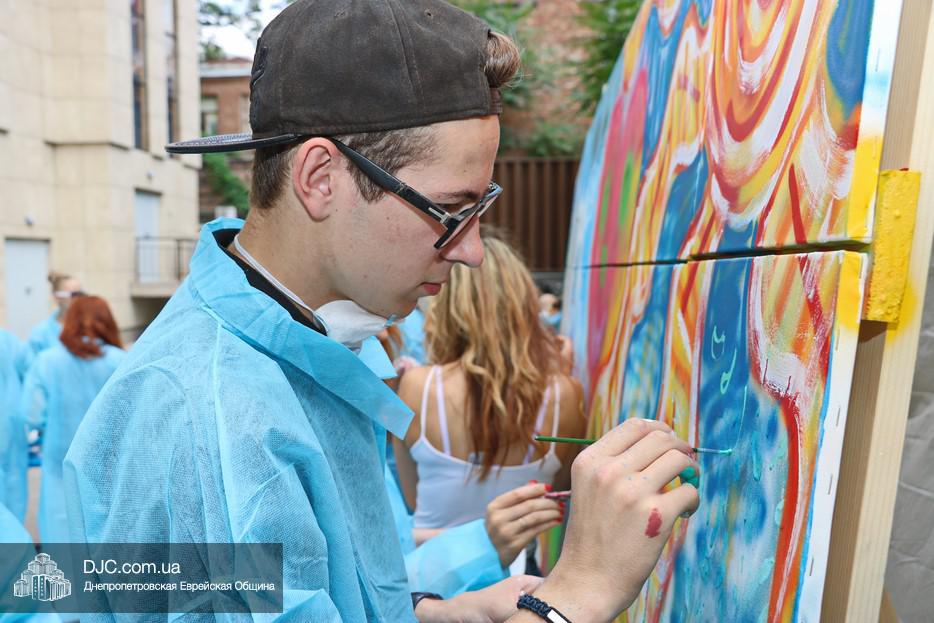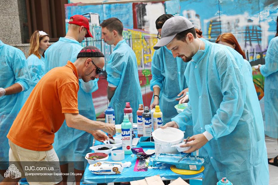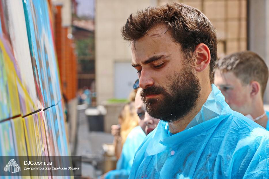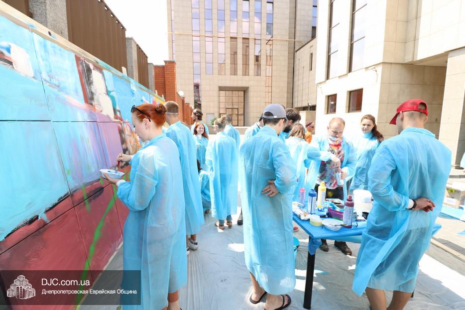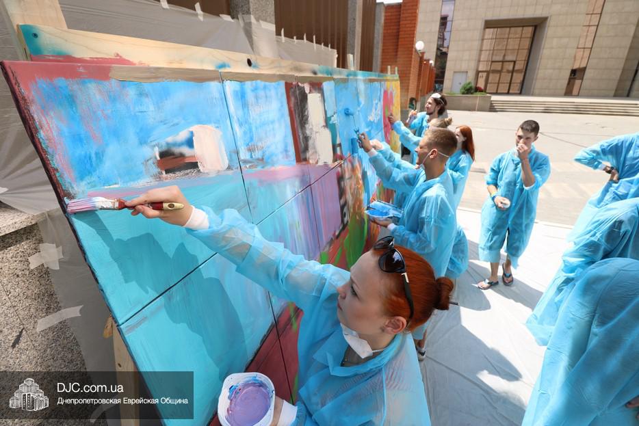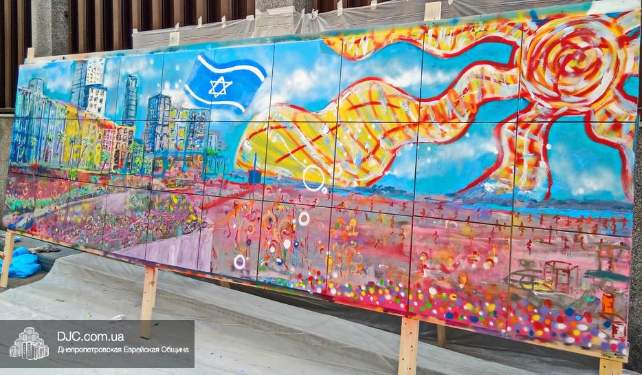 Арт-объект создавали во дворе крупнейшего в мире еврейского центра «Менора», основой для него послужили 30 подготовленных холстов, которые в соединении стали единой художественной плоскостью, длина которой составляла пять метров, а высота – полтора метра. Руководил процессом известный художник, участник уличного фестиваля стрит-арта «Mural Fest Dnipro» Илья Кудиненко. Подробнее о том, как ребята и девушки создавали произведение уличного искусства, нашему сайту рассказал Максим Касьянов, координатор деятельности Израильского Культурного Центра в Днепровском регионе: «Илья Кудиненко, известный художник, дал мастер-класс по различным художественным приемам: сухая кисть, цветовая растяжка, льющаяся техника Джексона Поллока, а также элементы stencil art. Используя новые навыки и умения, молодые люди окунулись в мир искусства и почувствовали себя настоящими художниками. Буквально за несколько часов коллективного творчества участники создали полотно, изображающее тель-авивский пляж.