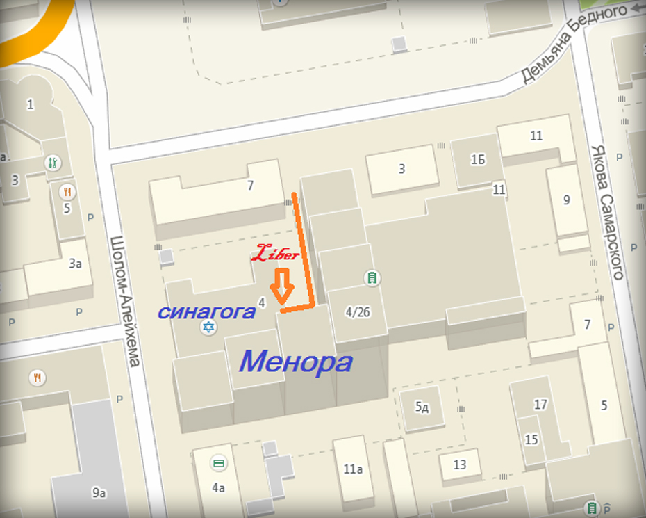 «Liber pool and bar» расположена на первом этаже административного здания комплекса «Золотой Розы». Пройти в нее можно через двор синагоги и бывшую учебную аудиторию «Шиурей Тора Любавич» или с улицы Демьяна Бедного через двор центра «Менора» и «Золотой Розы» (см. карту).