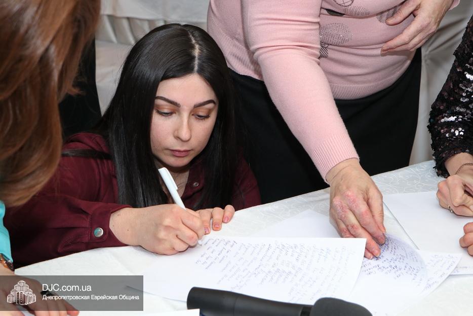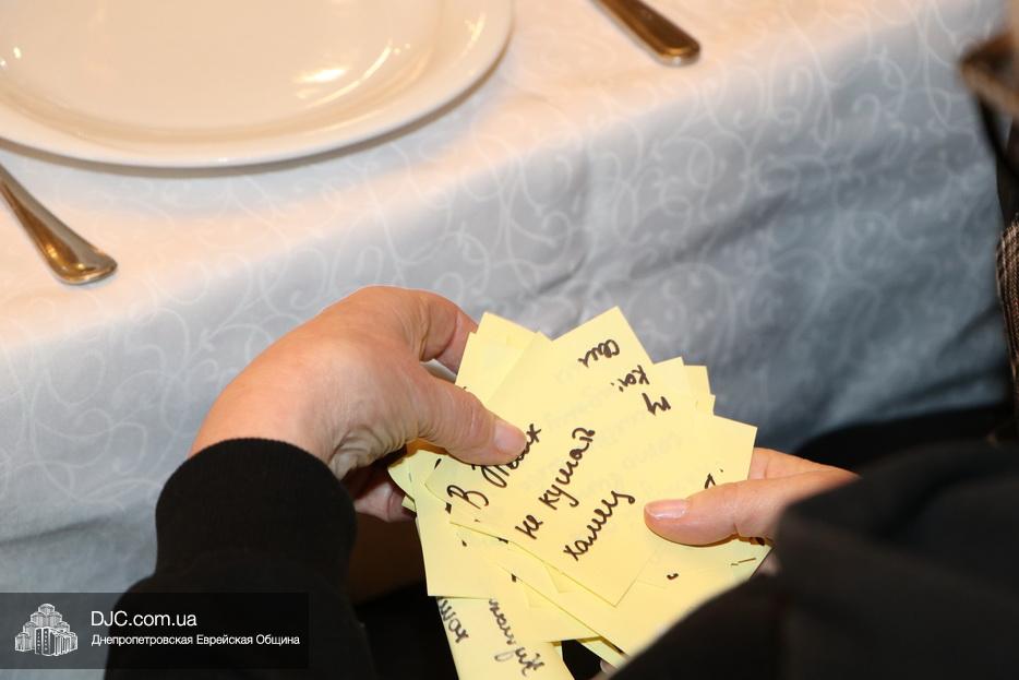 В начале мероприятия Хая Прасолова предлагала женщинам написать ПАН («пидьон а-нефеш», в буквальном переводе «письмо души» – письменное обращение к праведнику, чья душа покинула материальный мир) и дать цдоку.