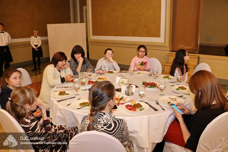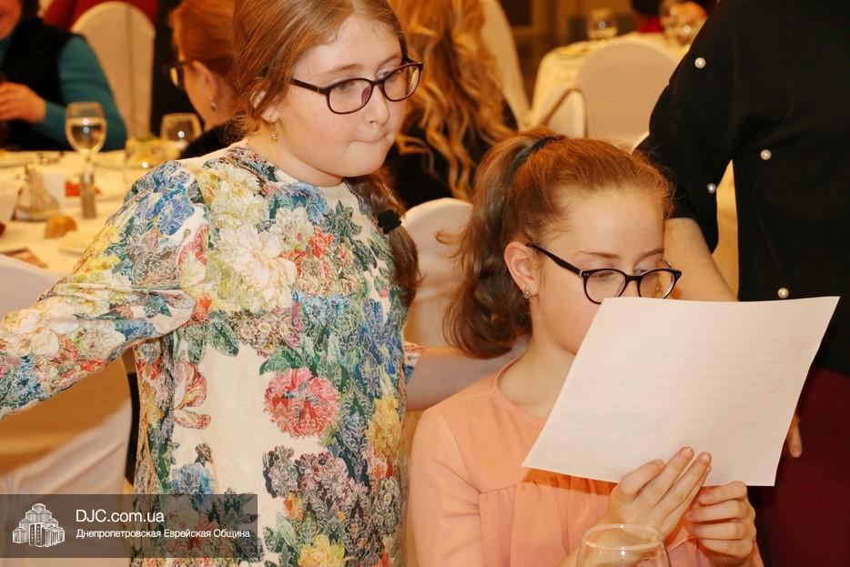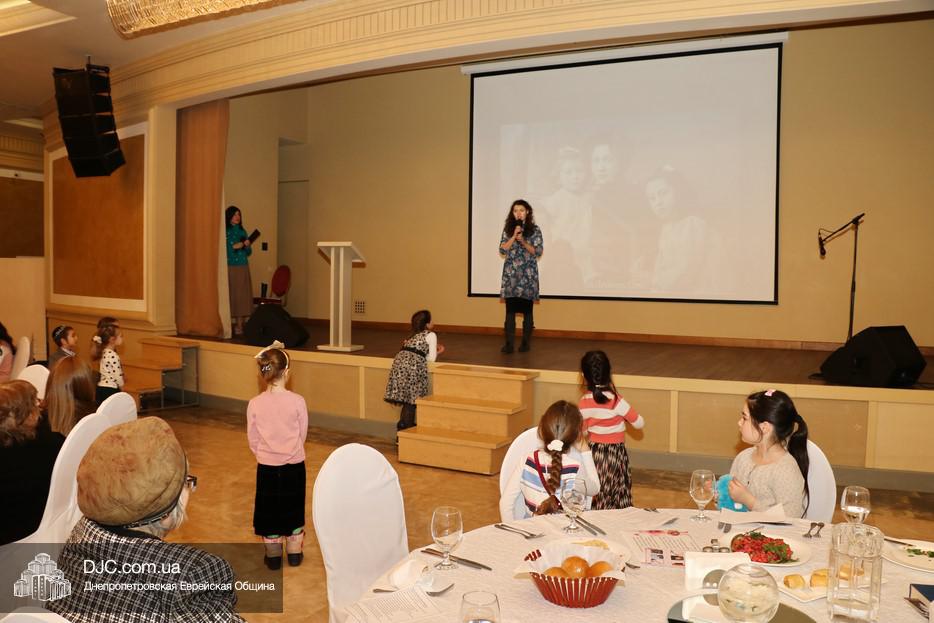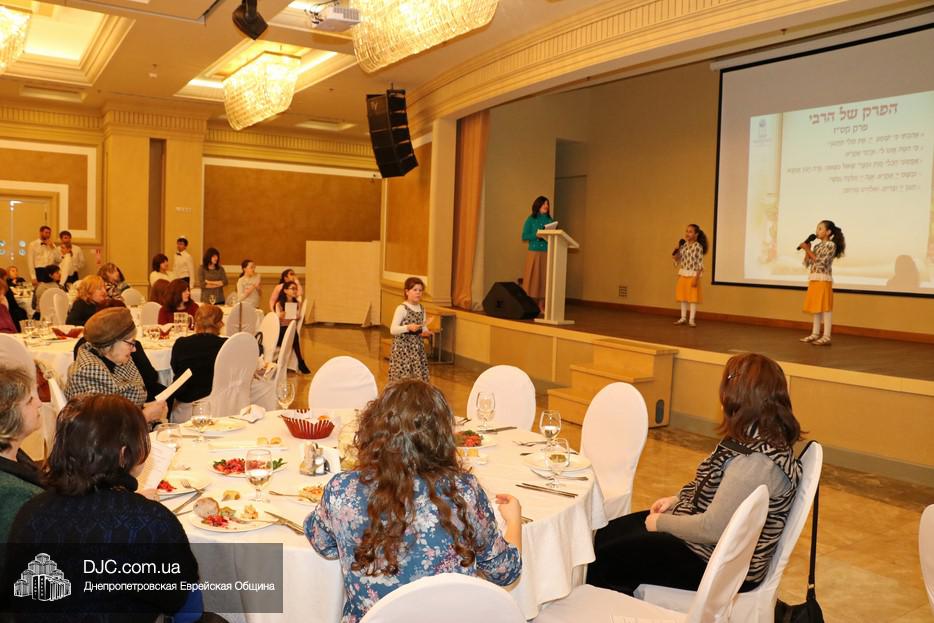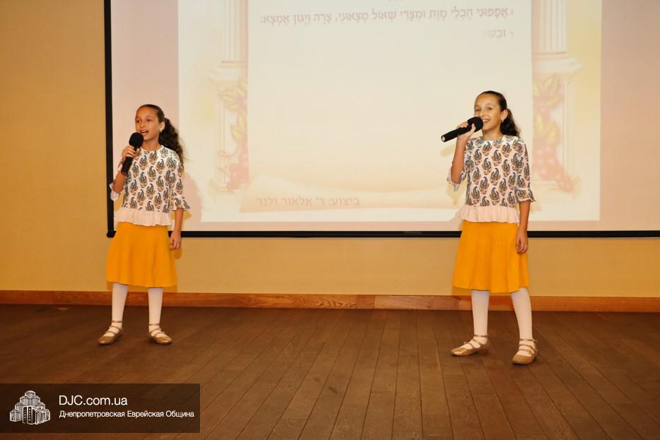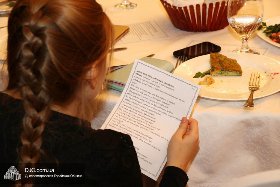 Традиционно в этот день принято читать Перек-тегилим Ребе и Ребецн, и эта традиция была воплощена в Днепре так – юные Шира и Хая Мушка Дорфман вдохновенно спели этот Перек, а все присутствовавшие могли подпевать талантливым девочкам, так как на столах лежали листочки со словами.