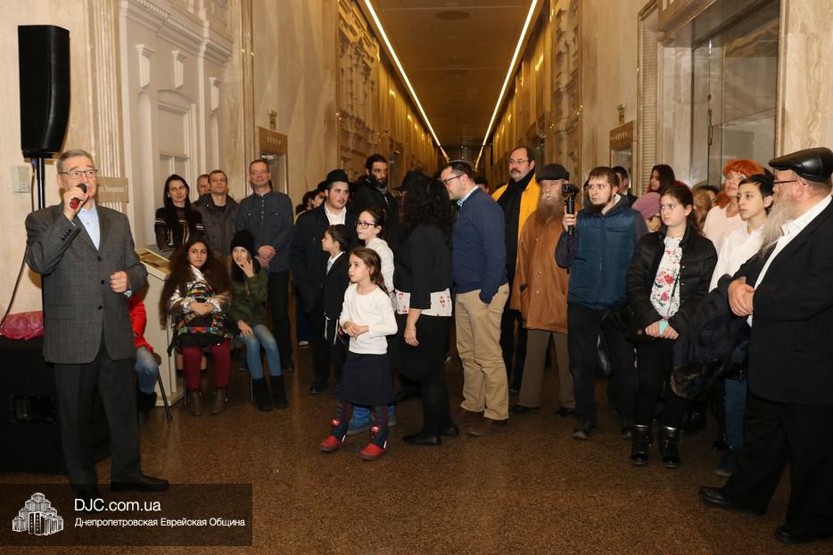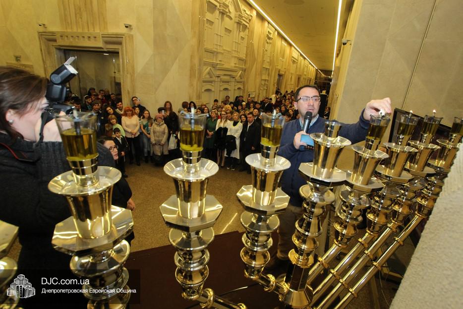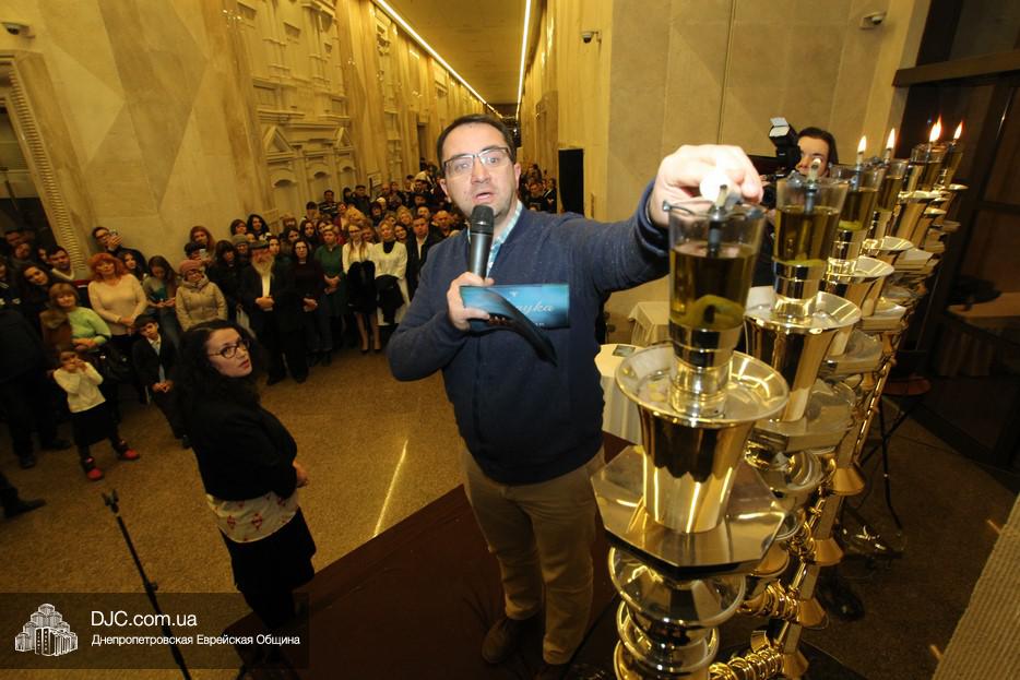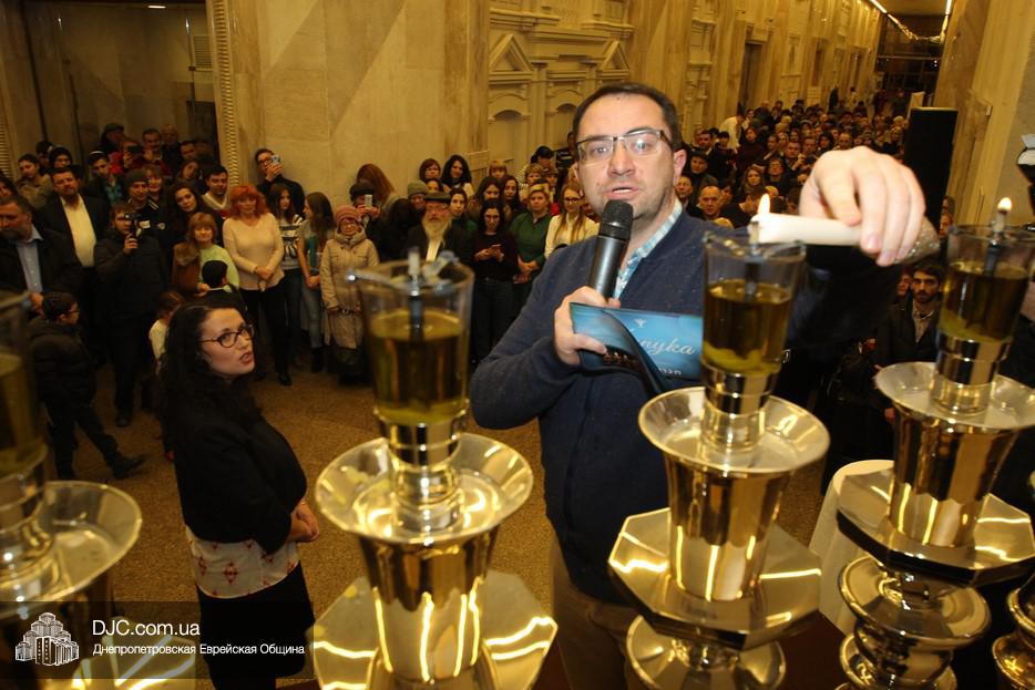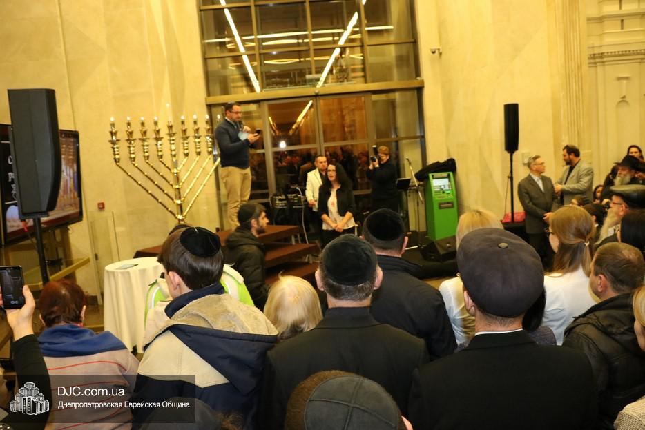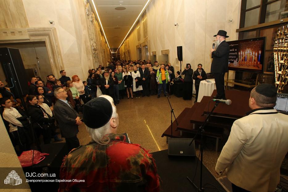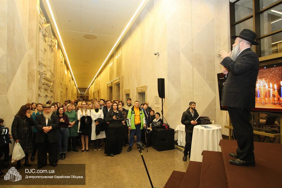 Натали Набитовски, Глава представительства в Днепре, тепло поприветствовала всех евреев города и региона, а ее муж Максим Лурье, Глава представительства в Харькове, прочитал благословения, зажег свечи, манифестировав их святость и значение ханукального чуда, а затем, под аплодисменты собравшихся, a-capella, исполнил ханукальный гимн «Маоз Цур».