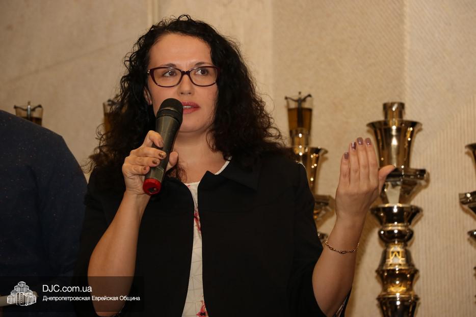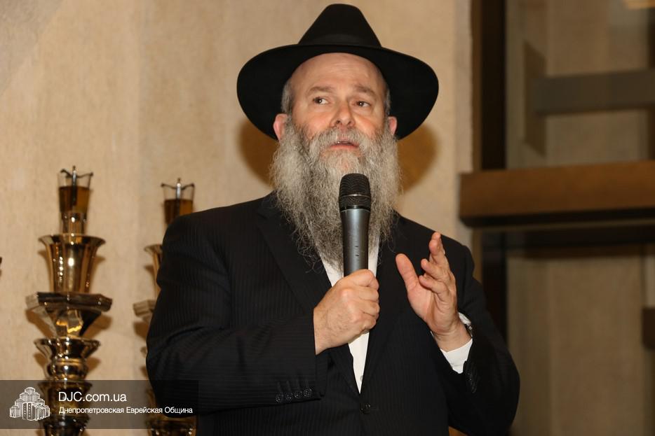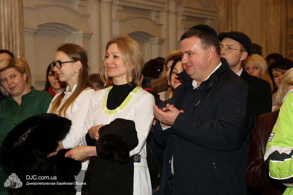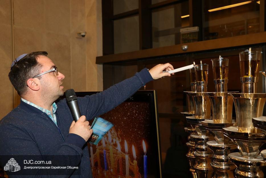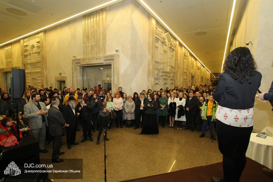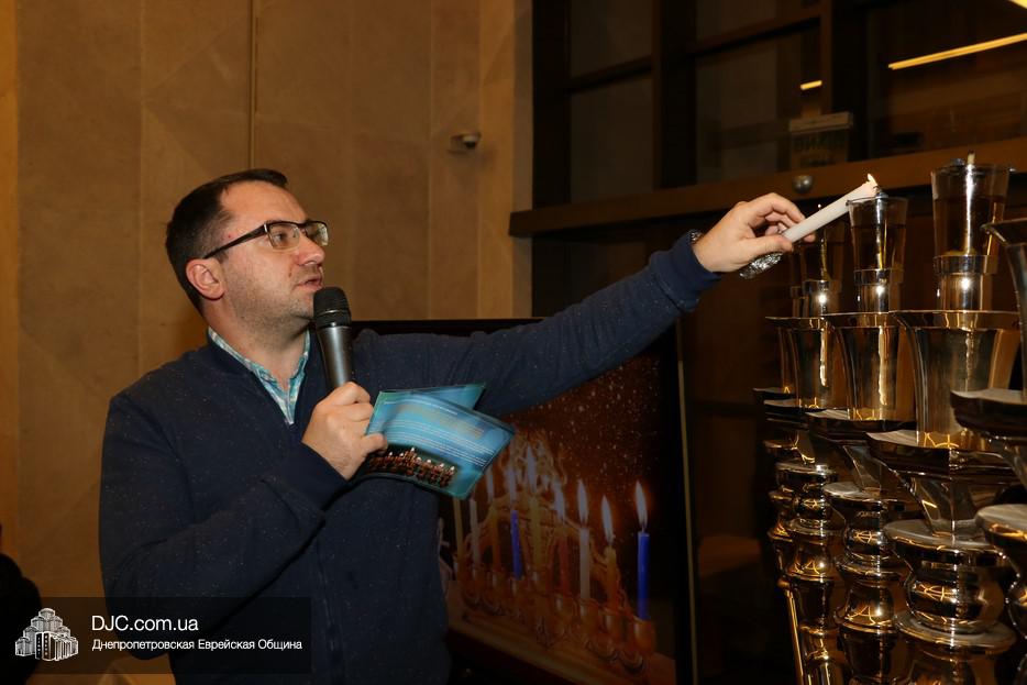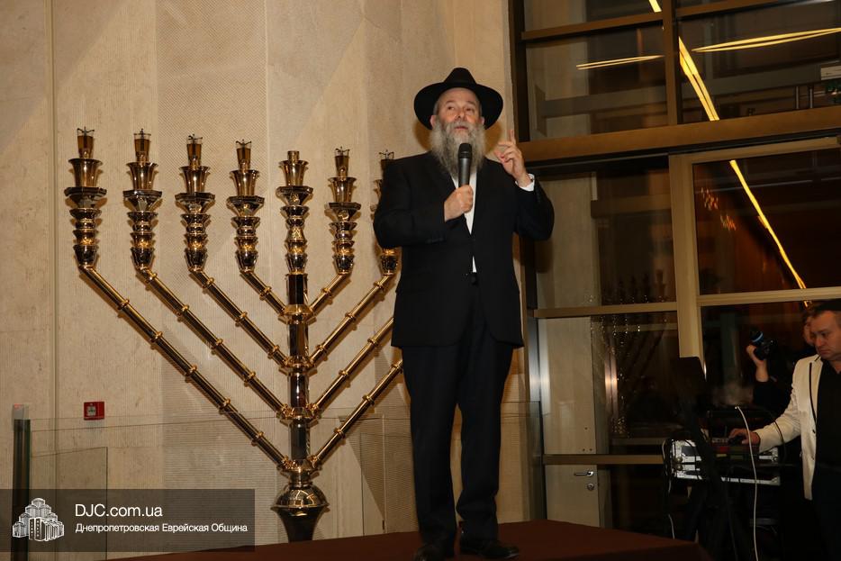 Натали Набитовски, Глава представительства в Днепре, тепло поприветствовала всех евреев города и региона, а ее муж Максим Лурье, Глава представительства в Харькове, прочитал благословения, зажег свечи, манифестировав их святость и значение ханукального чуда, а затем, под аплодисменты собравшихся, a-capella, исполнил ханукальный гимн «Маоз Цур».
