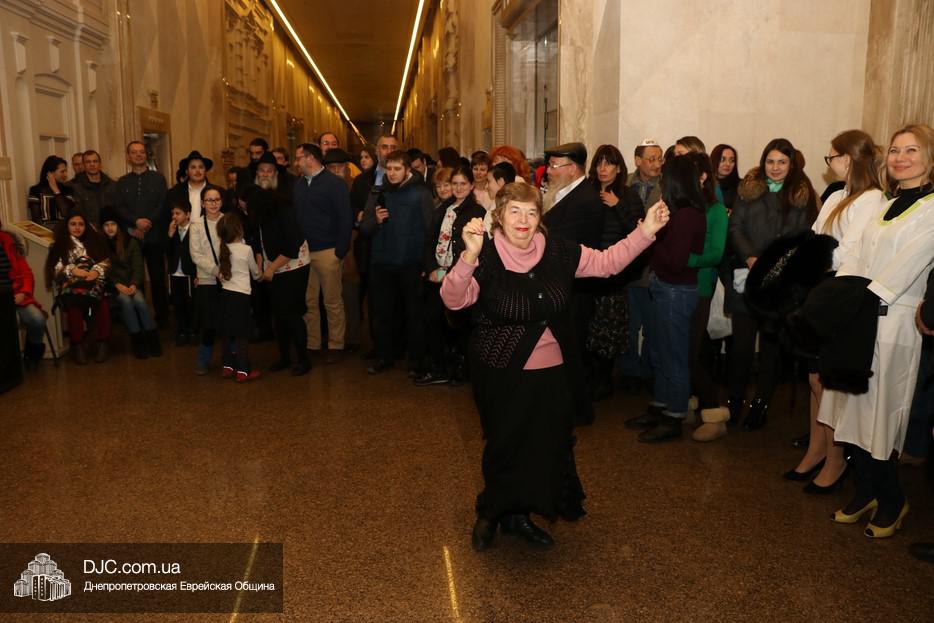 После завершения церемонии зажжения свечей в галерее «Меноры» прошло традиционное угощение пончиками, а ансамбль «а-Штыклах мазл» исполнил еврейские песни, под которые с удовольствием танцевали прихожане синагоги, пока гости Днепра фотографировались на память у горящей полным светом ханукии.