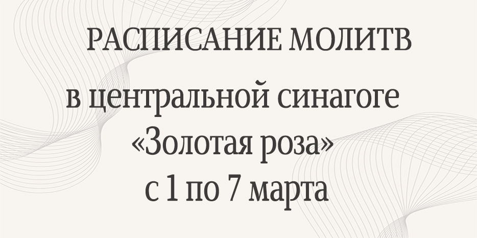 Центральная синагога «Золотая роза» информирует о времени начала молитв на период с 1 по 7 марта, которые будут проходить в главном молитвенном зале. Адрес синагоги: улица Шолом-Алейхема, 4.