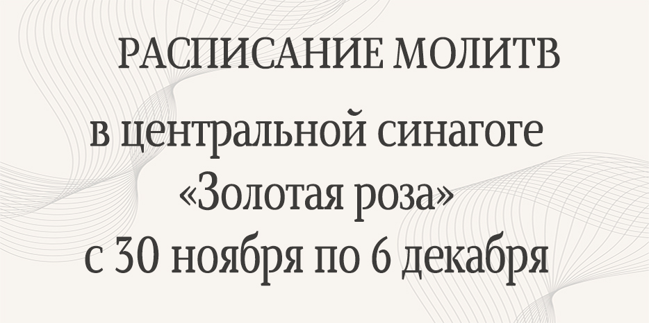 Центральная синагога «Золотая роза» информирует о времени начала молитв на период с 30 ноября по 6 декабря, которые будут проходить в главном молитвенном зале. Адрес синагоги: улица Шолом-Алейхема, 4.
