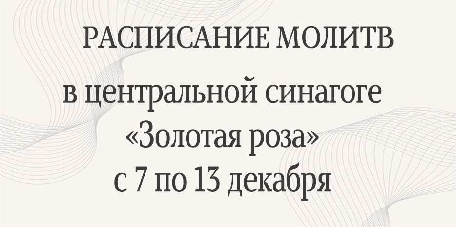 Центральная синагога «Золотая роза» информирует о времени начала молитв на период с 7 по 6 декабря, которые будут проходить в главном молитвенном зале. Адрес синагоги: улица Шолом-Алейхема, 4.