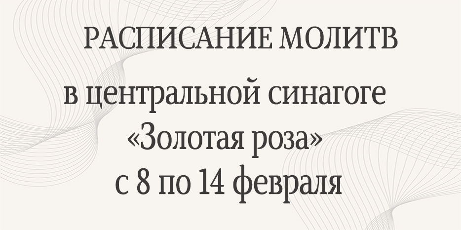 Центральная синагога «Золотая роза» информирует о времени начала молитв на период с 8 по 14 февраля, которые будут проходить в главном молитвенном зале. Адрес синагоги: улица Шолом-Алейхема, 4.