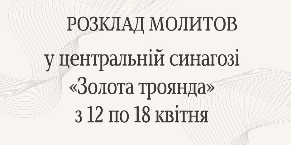 Центральна синагога «Золота Троянда» повідомляє про час початку молитов на період з 12 по 18 квітня, які відбуватимуться в головному молитовному залі. Адреса синагоги: вулиця Шолом-Алейхема, 4.