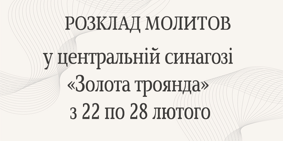 Центральна синагога «Золота троянда» повідомляє про час початку молитов на період з 22 по 28 лютого, які відбуватимуться в головному молитовному залі. Адреса синагоги: вулиця Шолом-Алейхема, 4.